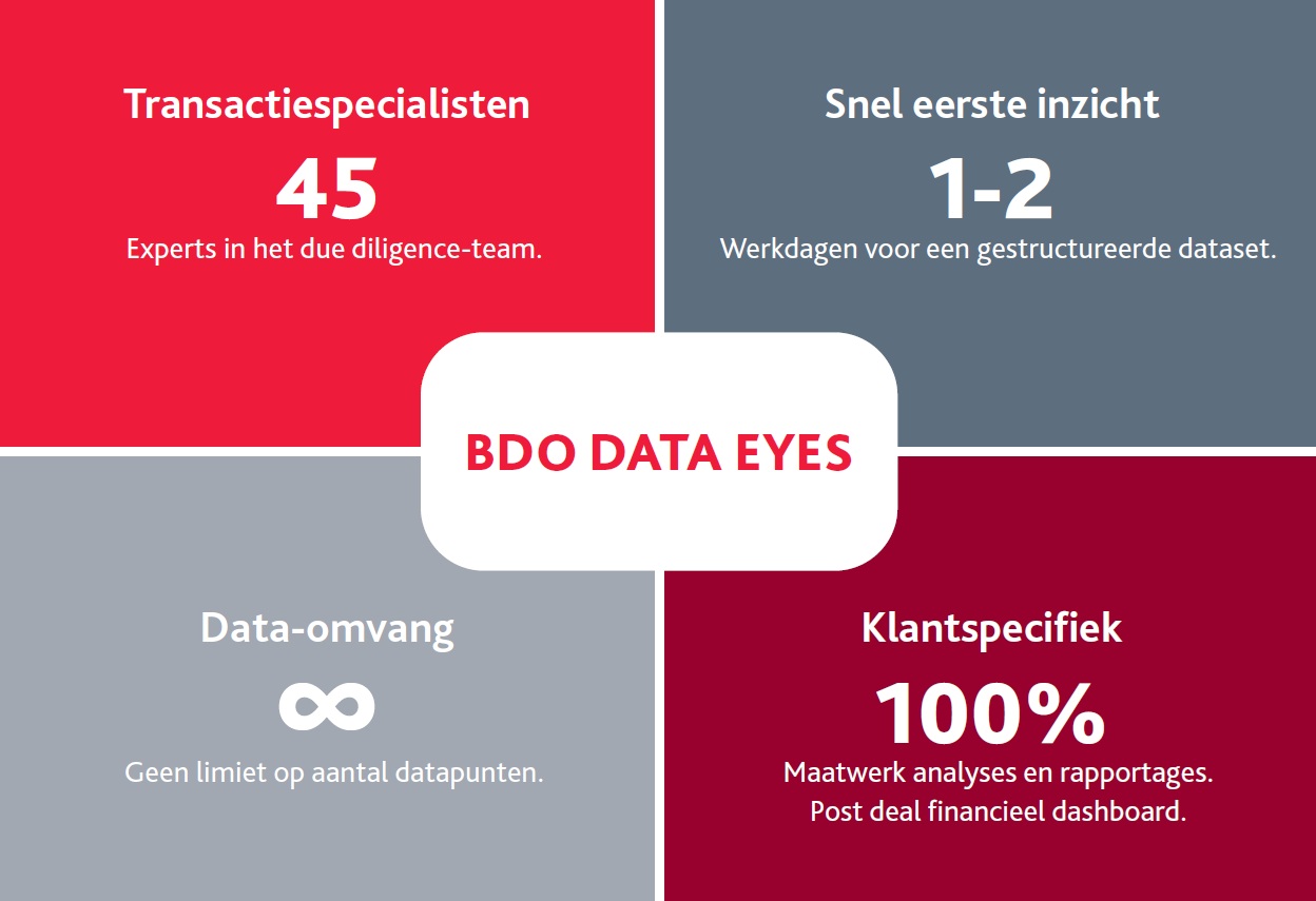 Met Data Eyes, de interne benaming voor de aanpak van data‑onderzoek bij due diligence, kan BDO een aangeleverde dataset geautomatiseerd verwerken, opschonen en structureren. Binnen één tot twee werkdagen is een geschoonde en gestructureerde dataset beschikbaar, met een aanzienlijk lagere foutgevoeligheid dan bij handmatige verwerking.
