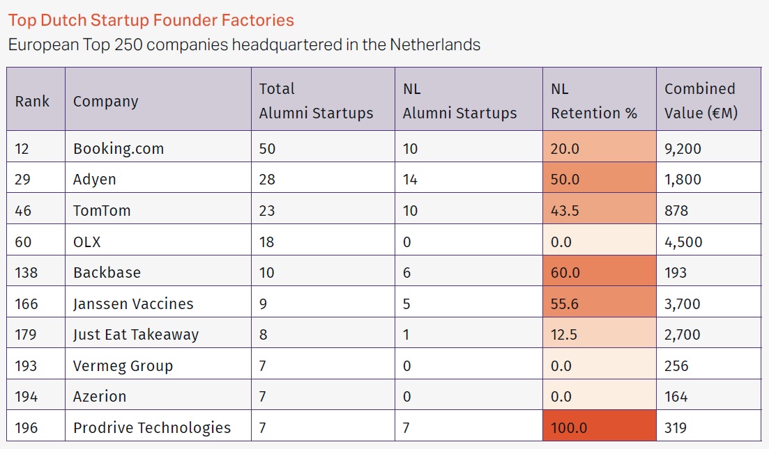 Maar liefst elf Nederlandse bedrijven staan in de Europese top 250 founder factories en brachten samen circa 140 alumniventures voort. Booking.com voert de lijst aan met vijftig geïdentificeerde founders, gevolgd door Adyen, TomTom, OLX en Backbase.