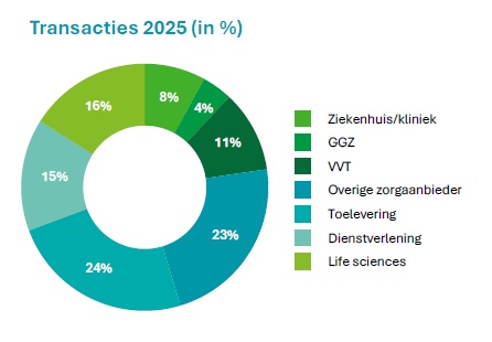 De subsector ‘overige zorgaanbieders’ (arbo, mondzorg, oogzorg) groeide juist met 55 procent, gedreven door PE-gestuurde consolidatie. Het Zweedse Oral Care en Colbe (voorheen Zorg van de Zaak) waren grote kopers in mondzorg (6 deals) en arbo (4 deals).