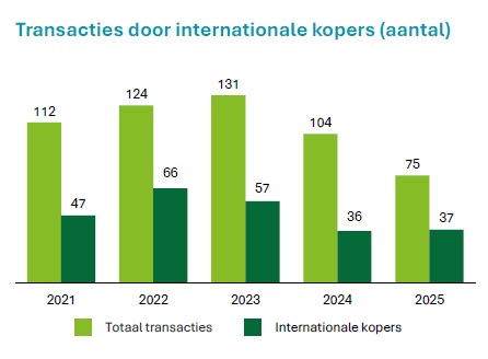 • Transactievolume daalt naar dieptepunt: Van 104 deals in 2024 naar 75 in 2025 – een afname die zelfs lager is dan in 2014.