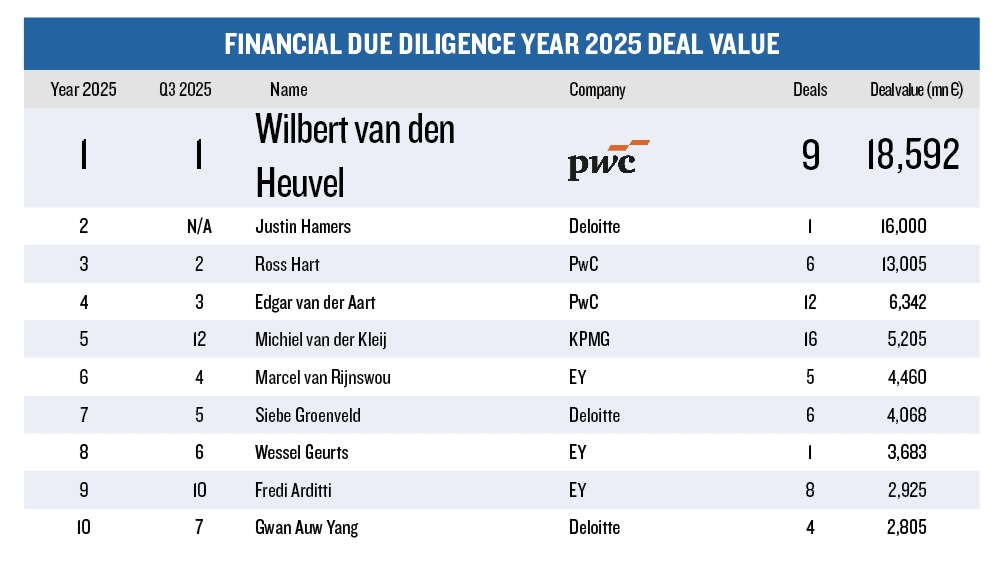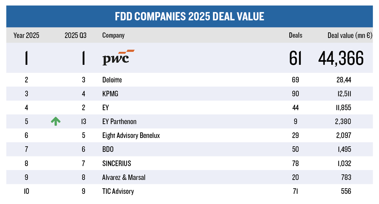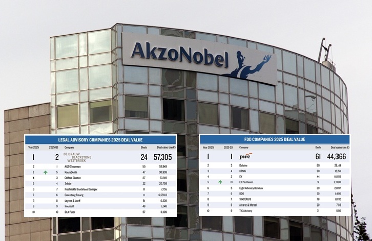 • Deloitte, die als due diligence-partij de lead had voor AkzoNobel, ziet zijn dealwaarde stijgen naar 28,44 miljard euro en klimt naar positie 2.