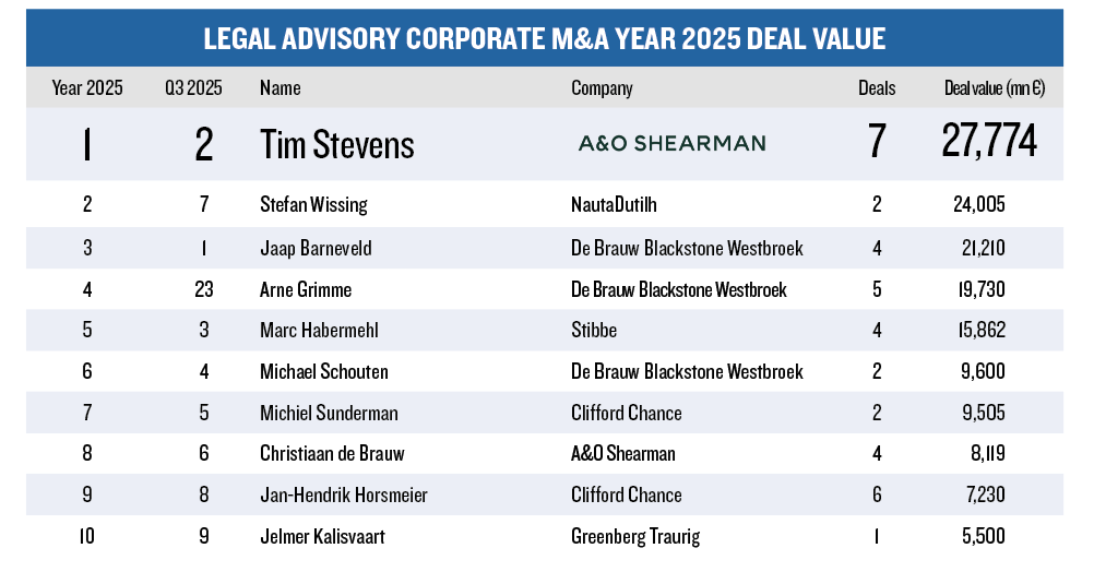 • Tim Stevens (A&O Shearman) behoudt zijn toppositie.
