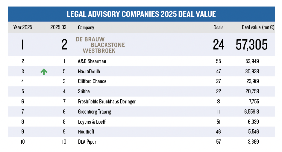• A&O Shearman, met een dealwaarde van bijna 54 miljard euro, schuift door naar positie 2.
