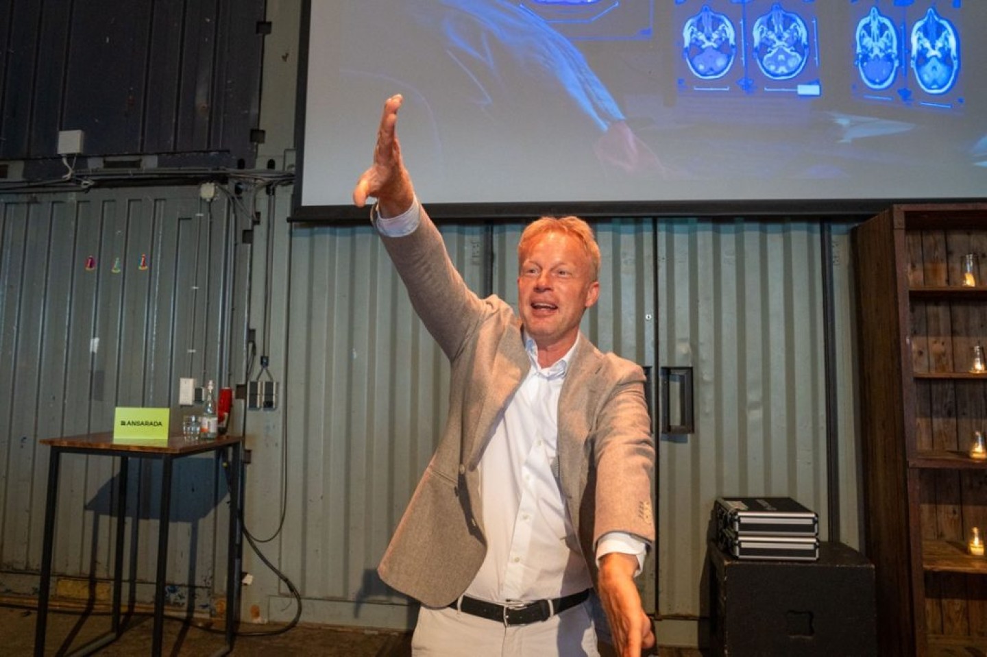 Toen kwam hij op: Paul Smit – filosoof, cabaretier en breinkraker van formaat. Wat volgde was een vlijmscherpe én hilarische masterclass over het brein, gedrag, technologie, en natuurlijk dopamine.