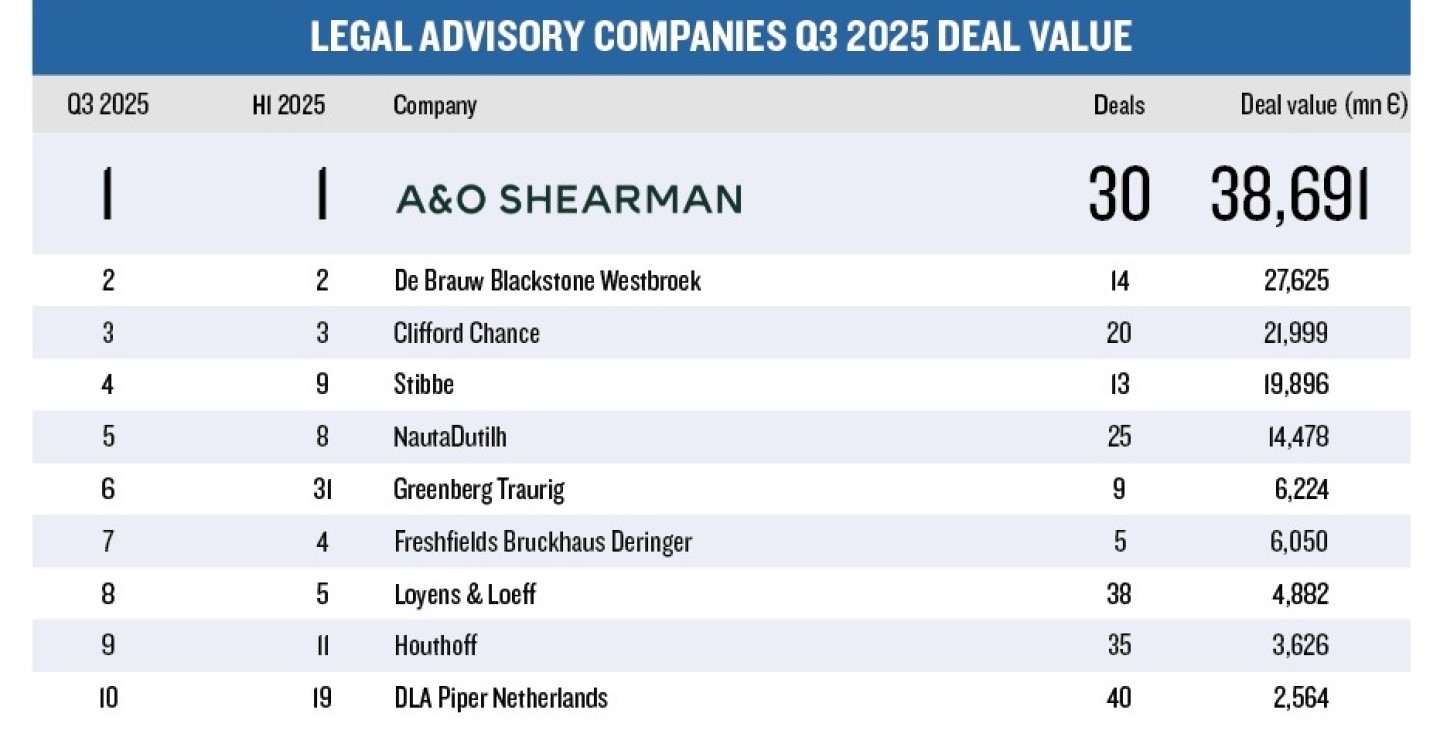 A&O Shearman en deBreij aan kop in League Tables Legal Advisory Q3, 2025