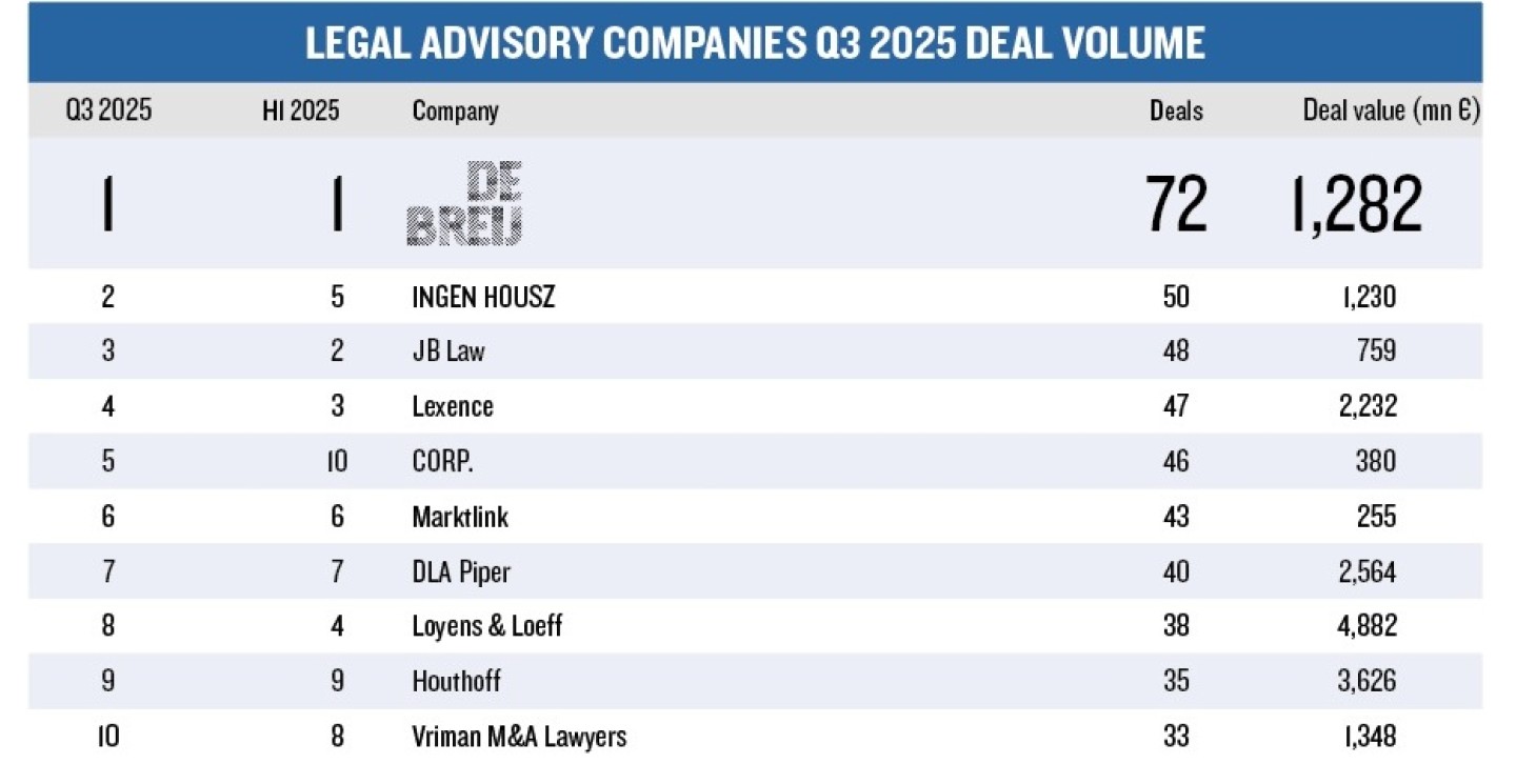 Qua dealvolume weet DeBreij hun positie van vorig kwartaal vast te houden. Het kantoor was betrokken bij maar liefst 72 transacties.