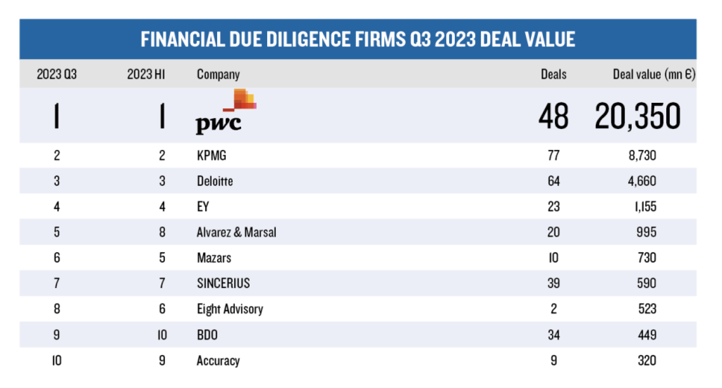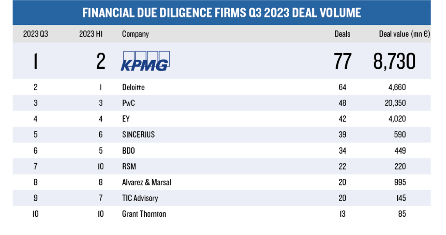 KPMG (positie 2) verzorgde het dd-onderzoek voor Eriks en Lone Star in één van de grotere transacties van het afgelopen kwartaal. En Deloitte (positie 3) ging aan de slag voor Infracapital bij de acquisitie van twee chemische terminals van Vopak.