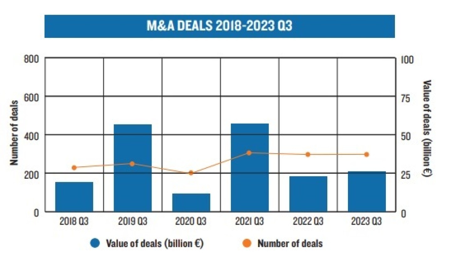 Qua dealvolume benadert het derde kwartaal dat van topjaar 2021, alleen de dealwaarde blijft sterk achter. De meest logische verklaring hiervoor is dat het aantal miljardendeals sterk is afgenomen door de geopolitieke onzekerheid en moeilijke kapitaalmarkten sinds 2022.