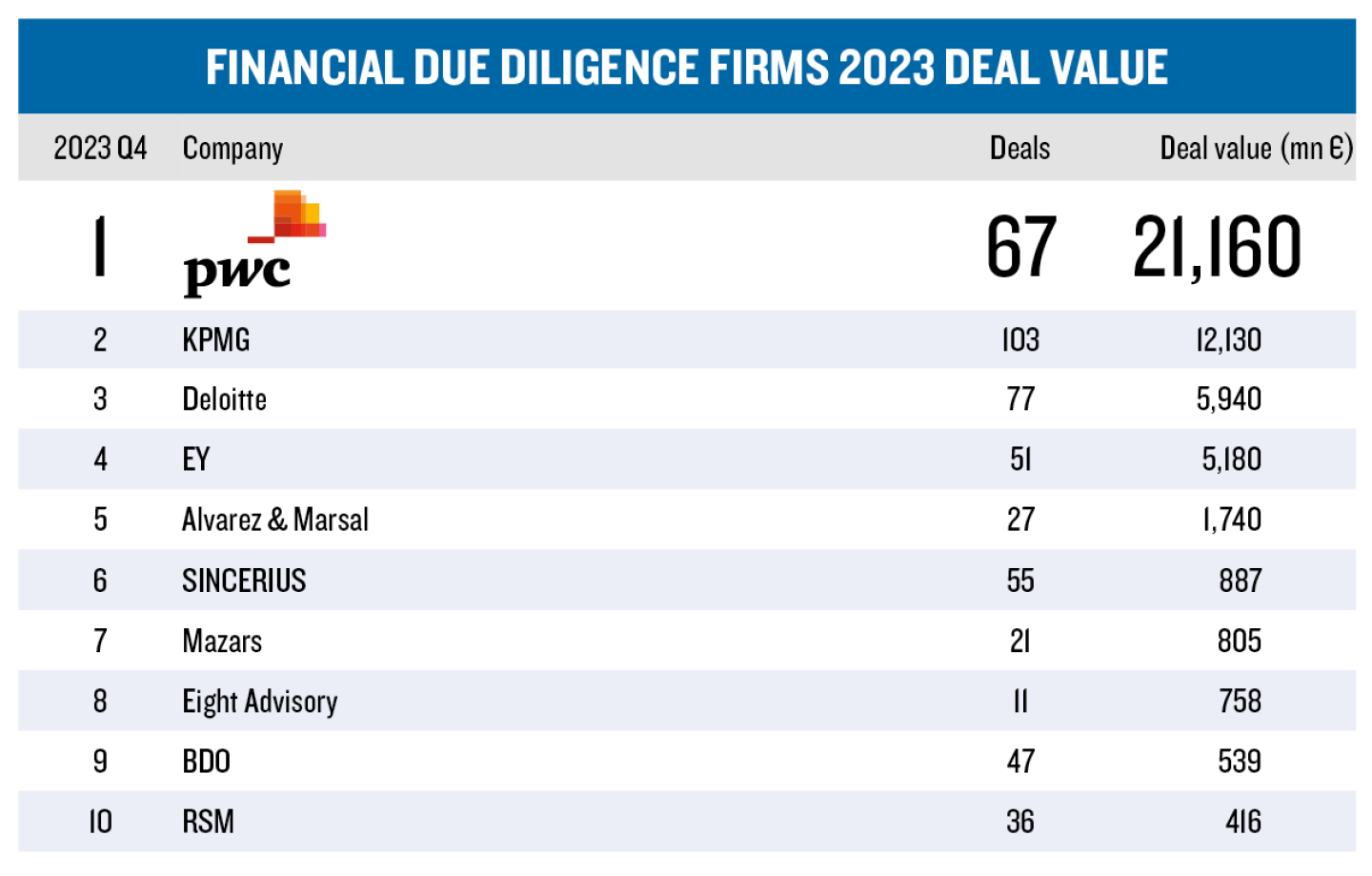 Toch vond er af en toe nog een miljardendeal plaats. Wat te denken van de overname van het in Rotterdam gezetelde graanverwerkingsbedrijf Viterra door het Amerikaanse Bunge, een deal van bijna zestien miljard euro. PwC deed het due diligence-onderzoek voor Vittera en eindigt daarmee op 1 als het gaat om totale dealwaarde.