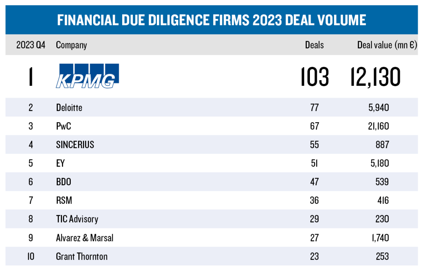 Gaat het om dealvolume, dan komt KPMG ruimschoot op de eerste plek met 103 deals in 2023. Het kantoor wordt gevolgd door Deloitte en PwC.