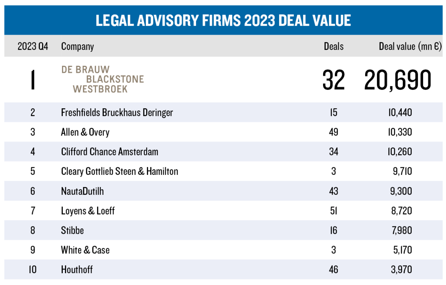 In de categorie Legal Advisory werd de hoogste dealwaarde gerealiseerd door De Brauw Blackstone Westbroek. Het kantoor was betrokken bij een aantal van het nog beperkte aantal Large Cap deals dat plaatsvond waaronder de overname van Unica Group door Triton en de acquisitie van Eriks door Lone Star (als legal advisor van de verkopende partij SHV).