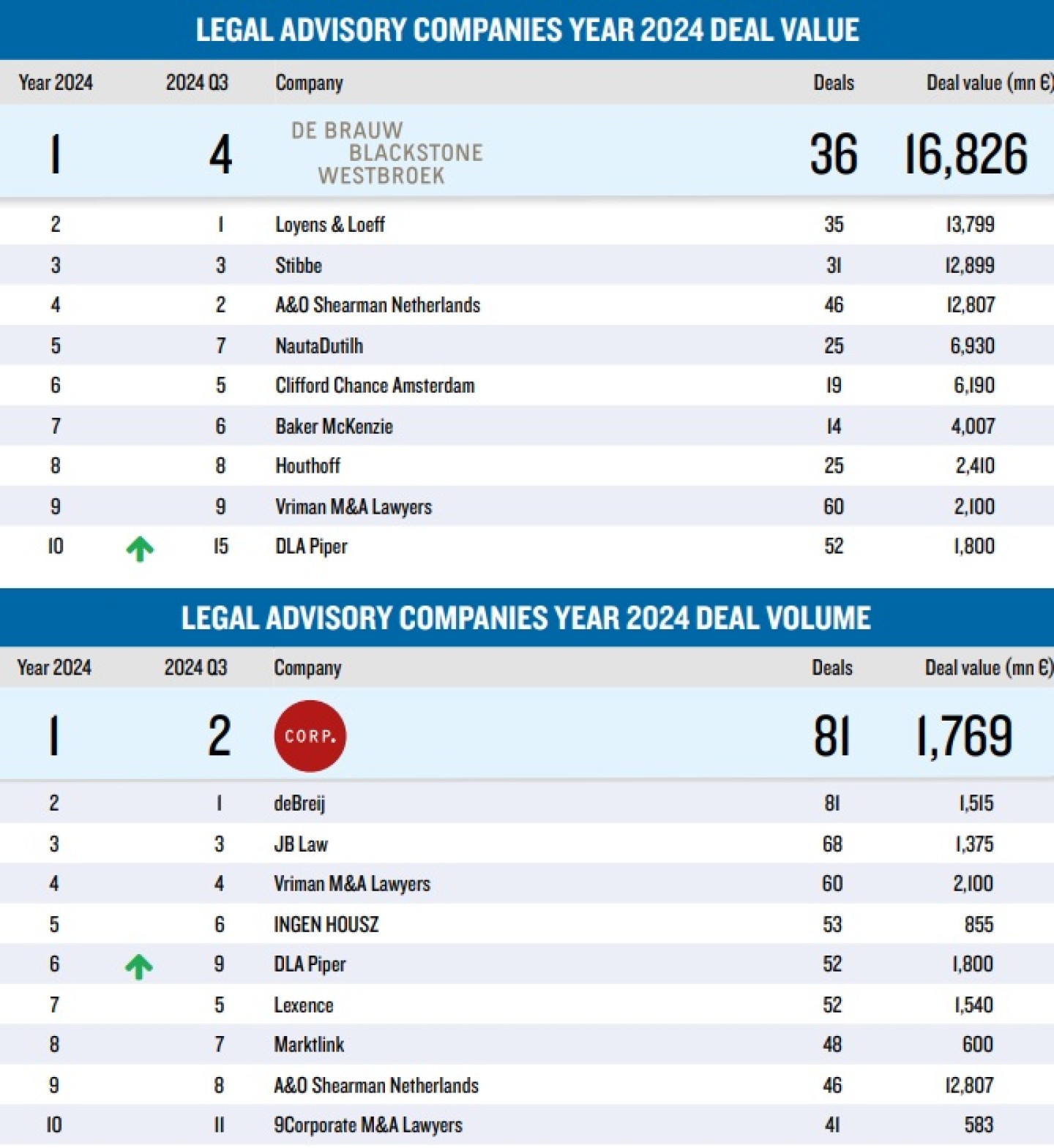 In het overzicht van het grootste dealvolume eindigt CORP. op de eerste plaats. Hoewel de nummer twee, JB Law, eveneens 81 deals wist af te ronden, claimt CORP. de toppositie dankzij een hogere totale dealwaarde.