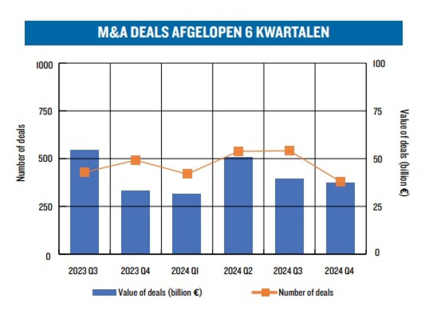 Het aantal deals waarbij een Nederlandse partij betrokken was, nadert de 2.000 in het afgelopen jaar. Dit is een lichte stijging ten opzichte van de voorgaande twee jaren. De totale gerealiseerde dealwaarde bleef echter achter. Qua dealwaarde was 2024 zelfs het slechtste M&A-jaar sinds 2020, het jaar waarin de coronapandemie de markt sterk beïnvloedde.