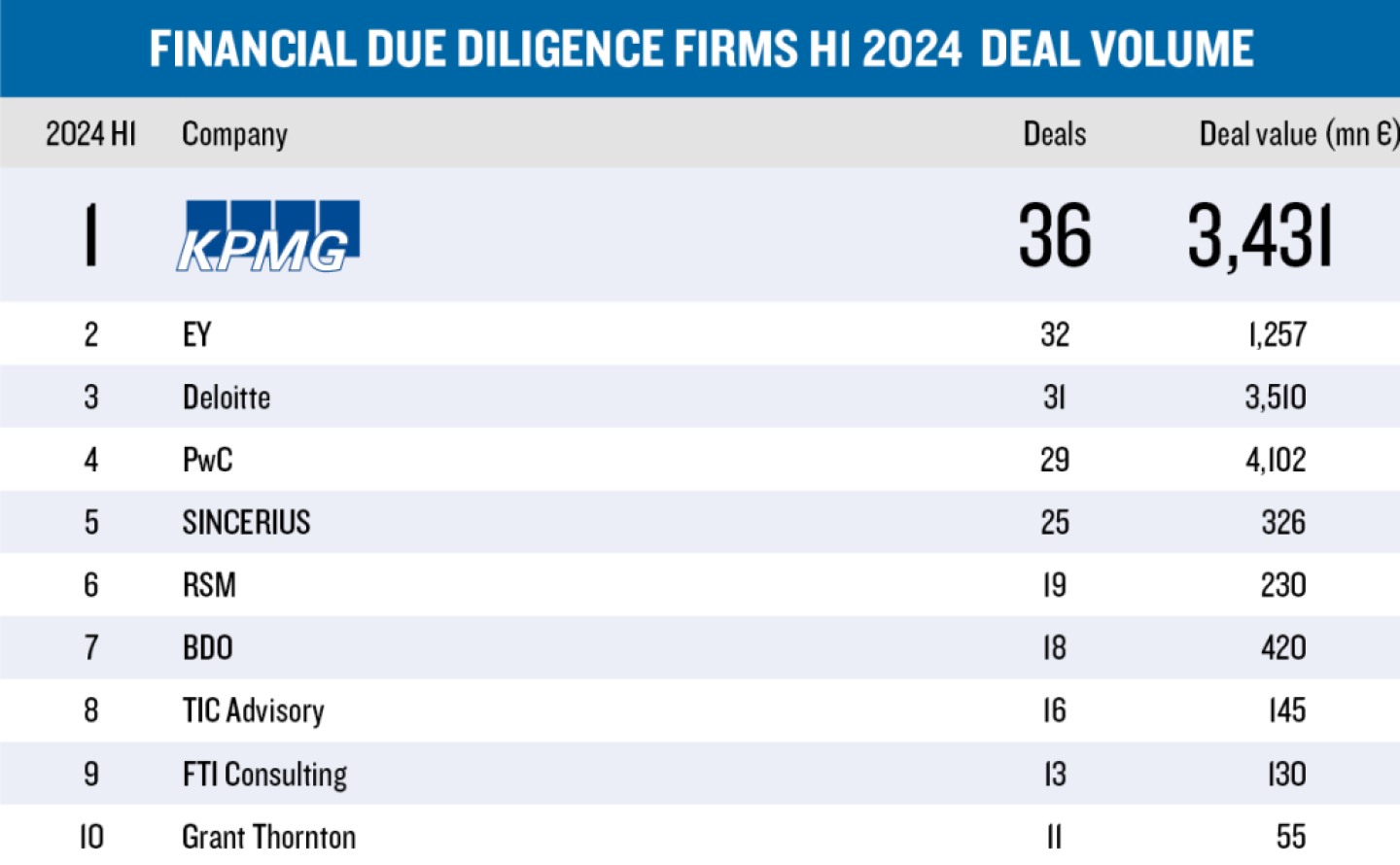 Op het gebied van dealvolume neemt KPMG de eerste plaats over van Deloitte in Q1. Ze deden het DD-onderzoek bij 36 transacties in H1, waaronder de verkoop van Leonardo Hotels aan Zien Group voor 400 miljoen euro.