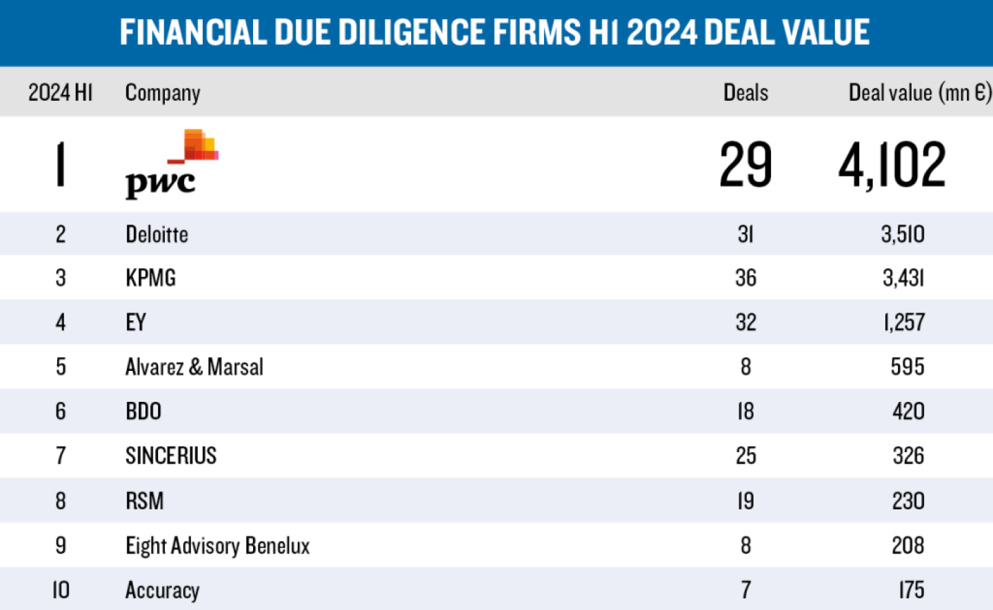PwC voert het overzicht aan van de League Tables qua dealwaarde. Ze realiseerden 29 deals met een totale dealwaarde van 4,1 miljard euro.