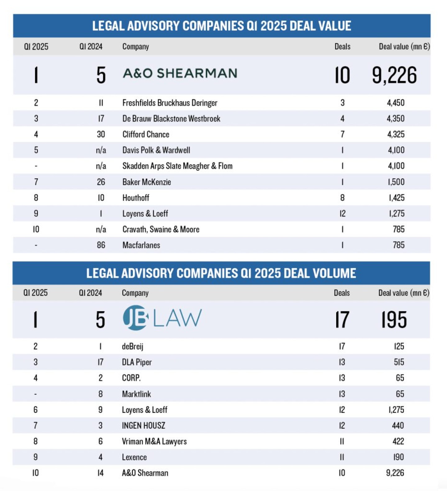 Op basis van dealwaarde eindigde A&O Shearman op de eerste plaats, gevolgd door Freshfields Bruckhaus Deringer, De Brauw Blackstone Westbroek en Clifford Chance.