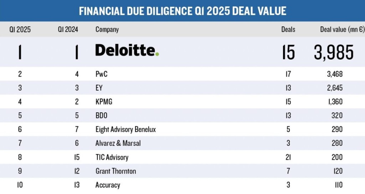 Deloitte behaalde de hoogste totale dealwaarde, gevolgd door PwC, EY, KPMG en BDO.