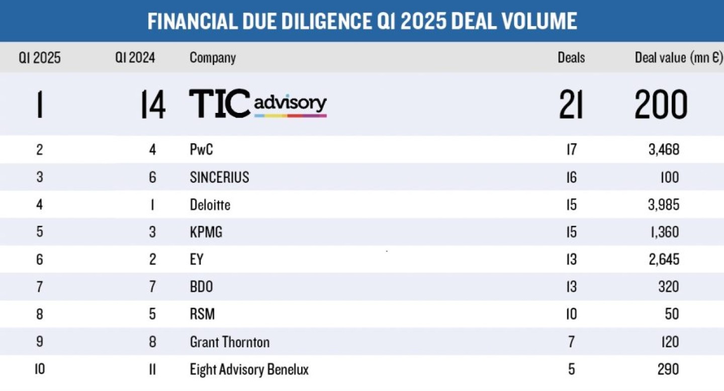 TIC Advisory was in Q1 de sterkste stijger qua dealvolume, met 21 afgeronde transacties. Het kantoor voerde onder andere due diligence-onderzoeken uit voor DELTA Equity Partners, Strix Group en Dimensio Verpakkingen.