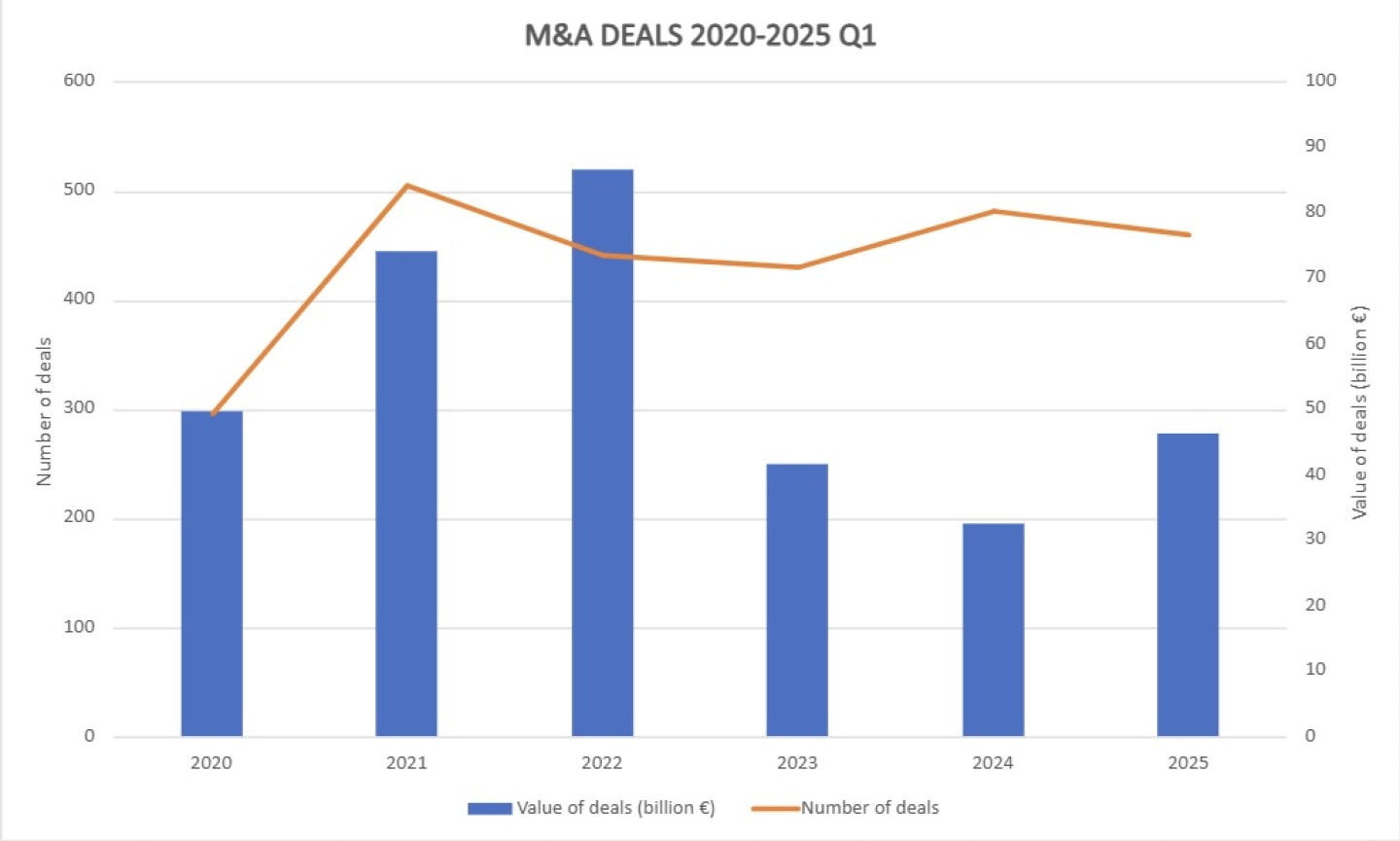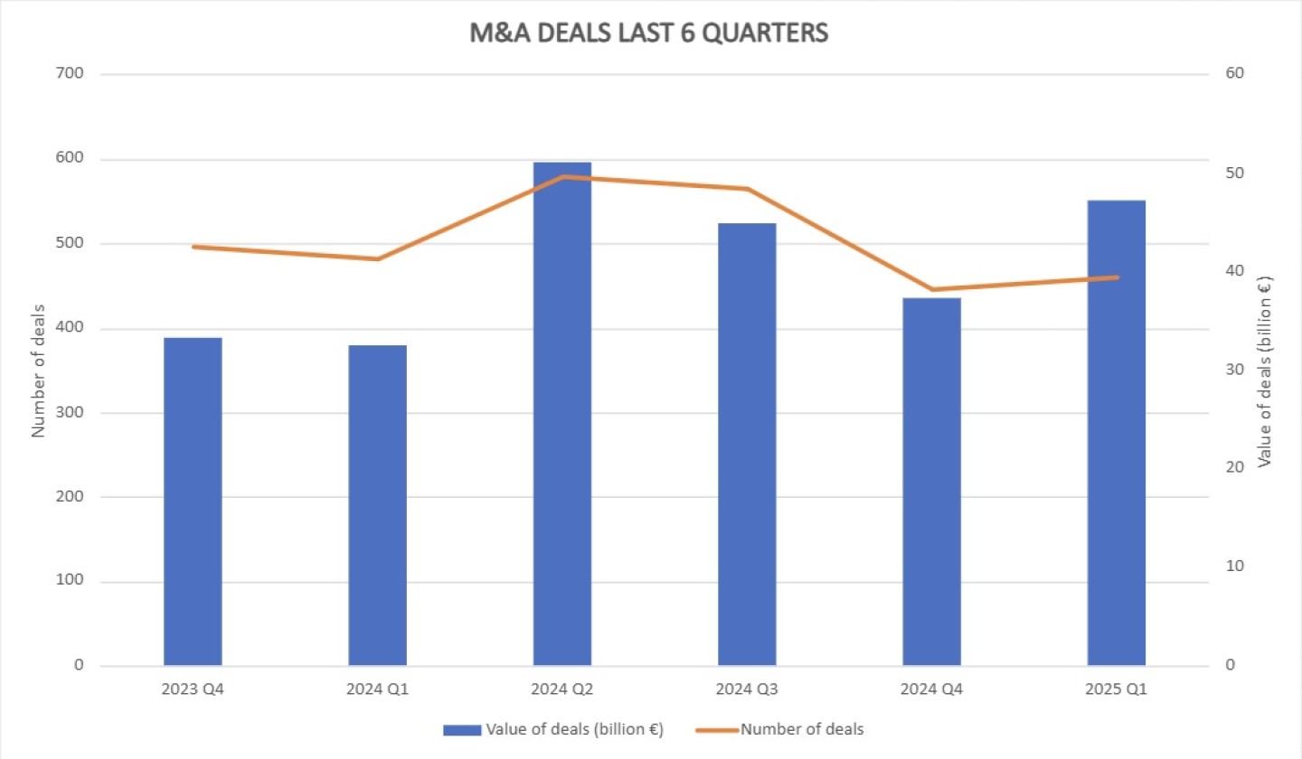 Na twee relatief rustige jaren lijkt de markt voor fusies en overnames (M&A) in het eerste kwartaal van 2025 weer wat aan te trekken. Het aantal deals nam toe ten opzichte van dezelfde periode in 2023 en 2024, en ook de totale dealwaarde lag aanzienlijk hoger.