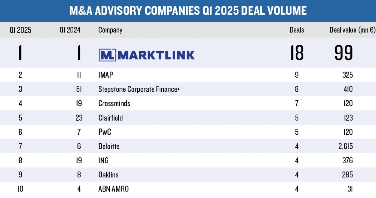 Met achttien deals in Q1 is Marktlink de koploper van de adviseurs qua dealvolume. “Het eerste kwartaal kende een voorzichtige start qua transactievolume, maar wij kijken met vertrouwen vooruit", aldus Tom Beltman, Managing Partner bij Marklink. “Onze internationale aanwezigheid met twintig vestigingen en de kracht van onze zelfontwikkelde AI-searchtools maken steeds vaker het verschil. De pijplijn met mandaten is goed en gemiddeld krijgen we de laatste maanden 3,6 biedingen per verkoopmandaat – er zijn dus voldoende kopers in de markt.”