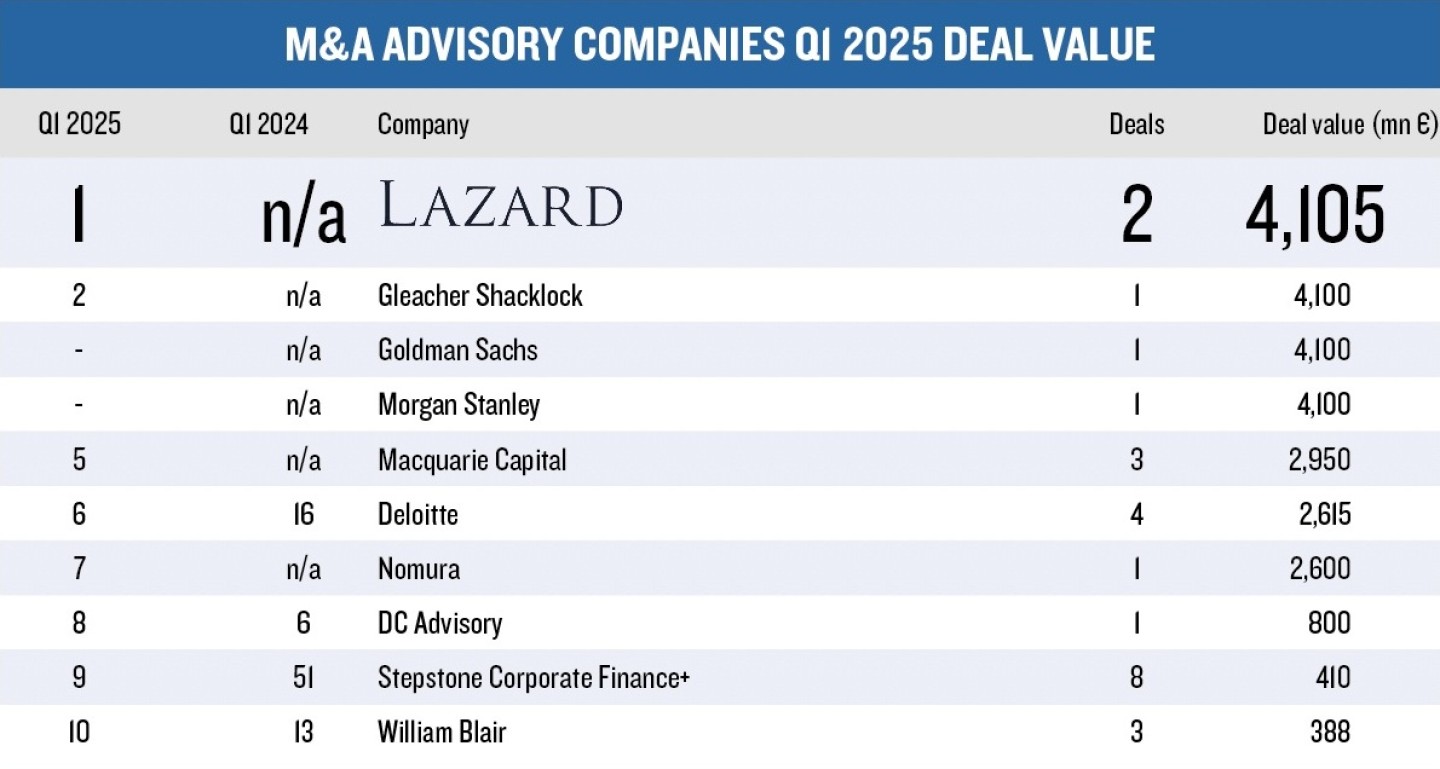 De lijst van adviesfirma’s die de meeste dealwaarde wisten te realiseren, wordt aangevoerd door vier grote zakenbanken (Lazard, Gleacher Shacklock, Goldman Sachs en Morgan Stanley), die alle vier betrokken waren bij de overname van Just Eat Takeaway door Prosus.