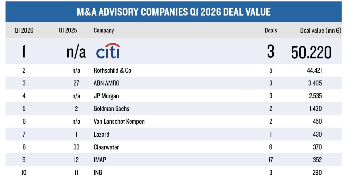 De topadviseurs van Q1 2026 De deal tussen Unilever en McCormick was bepalend voor de ranglijst. Citigroup veroverde de eerste positie qua dealwaarde, gevolgd door Rothschild & Co.