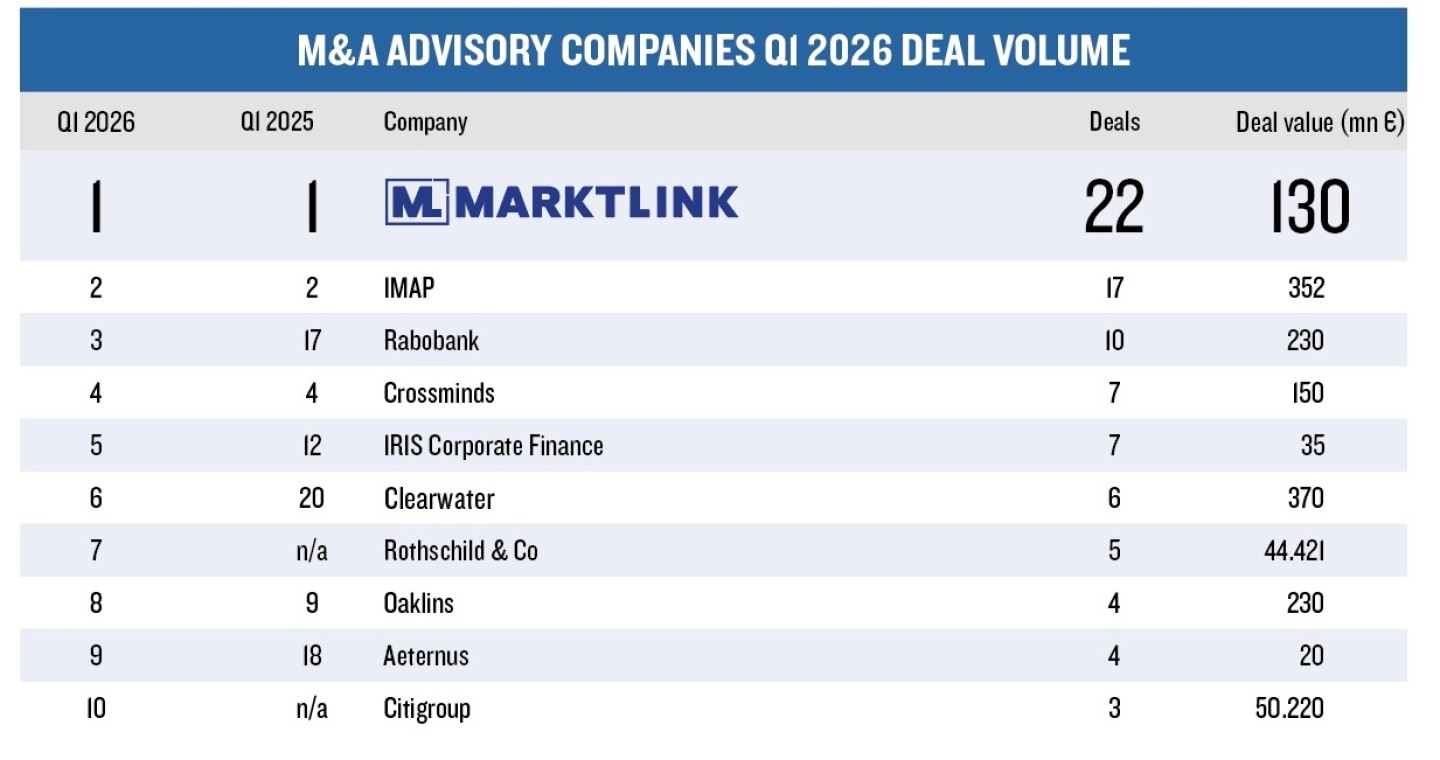 Dealvolume: Marktlink aan kop Met 22 deals staat Marktlink bovenaan qua dealvolume in Q1. IMAP volgt met 17 transacties, terwijl Rabobank 10 deals afrondde, waaronder de verkoop van de cateringdivisie van KLM aan Gate Gourmet.