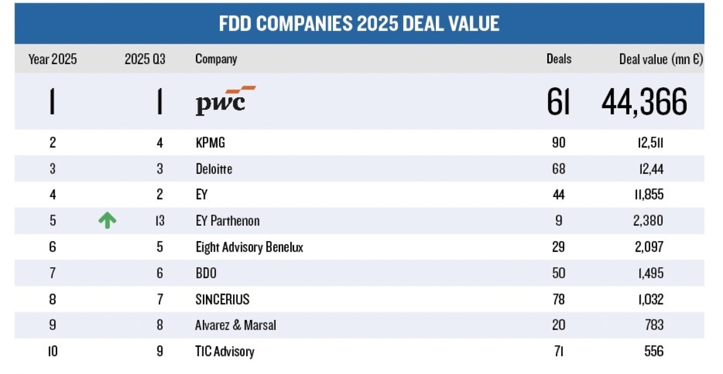 Een opvallende stijger in de top 10 is EY-Parthenon dat op positie 5 eindigt. Deze stijging is te verklaren doordat sinds juni 2025 de afdelingen Corporate Finance, Transaction en Strategy van EY juridisch zijn ondergebracht bij EY-Parthenon.