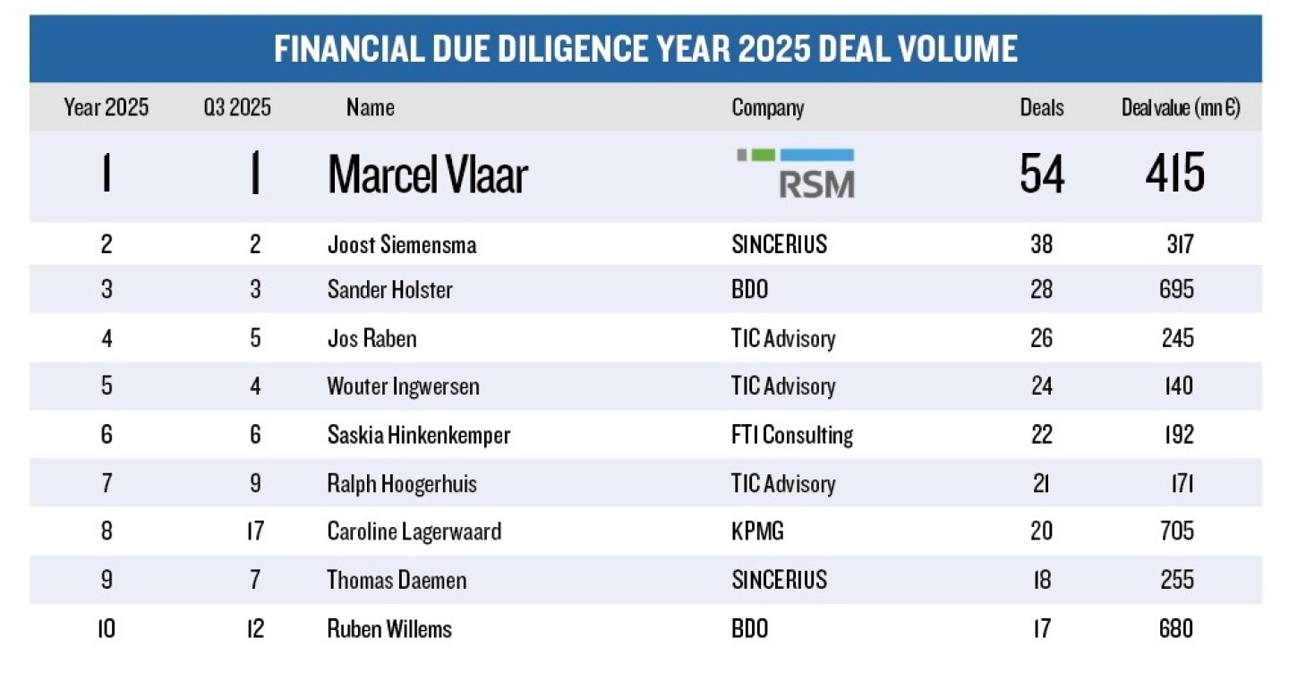 Kijkend naar het aantal transacties liet Marcel Vlaar (RSM) de concurrentie ruimschoots achter zich, met een opvallend resultaat van 54 afgeronde deals. Joost Siemensma (SINCERIUS) volgt met 38 transacties, terwijl Sander Holster (BDO) de top drie completeert met 28 afgeronde overnames.