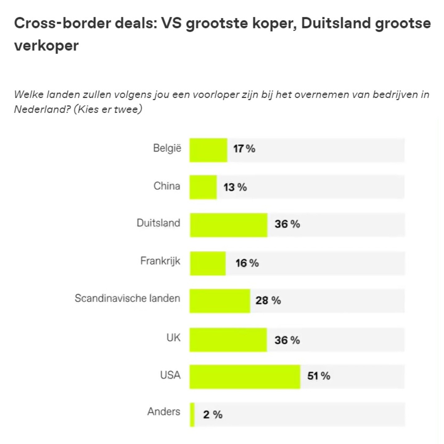 Meer dealmakers denken er zo over: een kleine 52 procent verwacht dat de VS een voorloper zal zijn bij het overnemen van bedrijven in Nederland en een kleine 36 procent heeft die verwachting ten aanzien van Duitsland (en, ondanks de Brexit, van Groot-Brittannië). Alleen staat de Duitse economie voor de nodige uitdagingen, waardoor de koopdrift van ondernemingen daar de komende tijd misschien wat zal afnemen. De positie van de VS als grootse koper van Nederlandse bedrijven lijkt echter onbedreigd: "De VS blijft een dominante speler", zoals Daphne Bens, hoofd van de Corporate groep bij advocatenkantoor DLA Piper Amsterdam zegt.