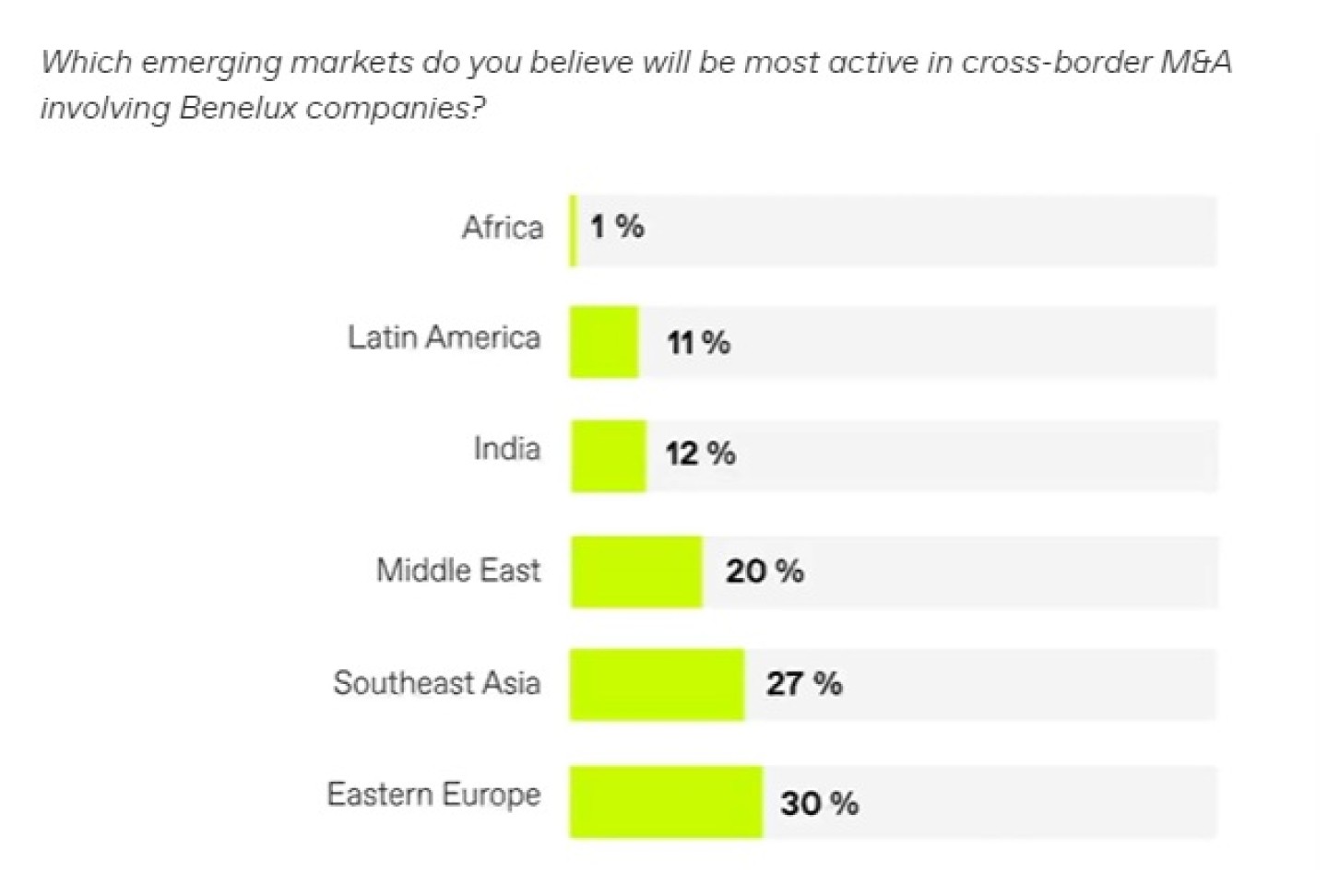 Conclusie Hoewel de focus van veel experts vaak op Aziatische markten ligt, laat het M&A Trendonderzoek zien dat Oost-Europese bedrijven, mede door hun technologische vooruitgang en strategische ligging, een belangrijke rol spelen in grensoverschrijdende overnames in de Benelux. Deze trend lijkt zich voort te zetten, met Oost-Europa als een voorloper op dit gebied. Opkomende markten in Zuidoost-Azië en het Midden-Oosten worden eveneens belangrijker, wat wijst op een diversificatie van kapitaalstromen en een verschuivende focus in het internationale M&A-landschap.