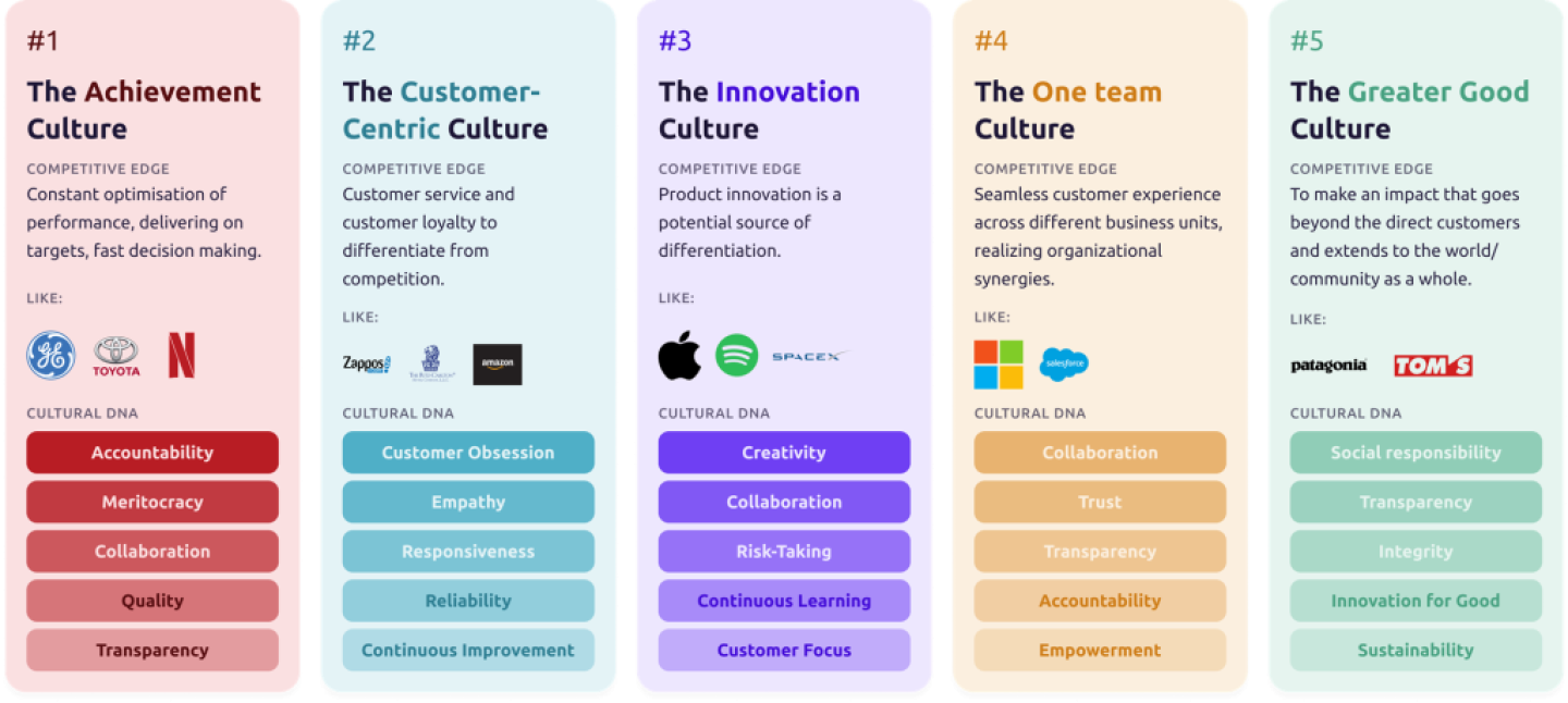 Zodra de mate van gewenste culturele integratie bewust is gemaakt is het tijd voor de volgende stap: bepalen welke type cultureel DNA optimaal geschikt zou zijn om de beoogde groeistrategie te realiseren. Dat start dus de missie van de onderneming: wat wil het bereiken en welk onderscheidend vermogen ten opzichte van andere aanbieders gaat de onderneming in staat stellen succesvol te zijn? Hoewel elke context en startpositie uniek is, zijn er vijf culturele archetypen die erg verhelderend zijn bij het definiëren van het beoogde culturele DNA.