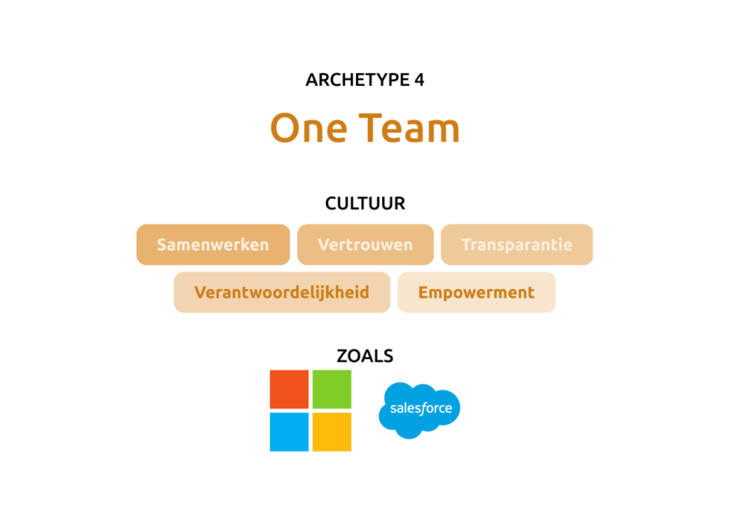 Passend Cultureel Archetype: In de One-team cultuur is effectieve samenwerking tussen teams het hoogste doel. Iedereen wordt aangemoedigd om bij beslissingen het grotere geheel in gedachten te houden. Processen en disciplines worden gedeeld, rollen zijn duidelijk gedefinieerd en solidariteit binnen het team wordt gewaarborgd zodra een beslissing is genomen.