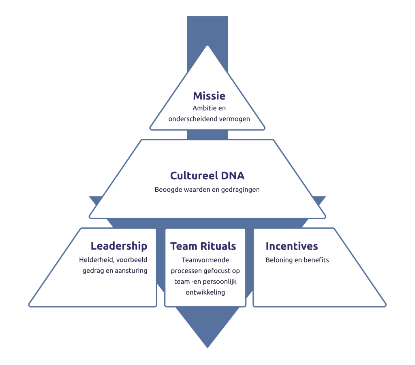 De drie voornaamste cultuurbepalende factoren binnen een bedrijf zijn leiderschapsstijl, de invulling van de team rituelen en de inrichting van beloningsbeleid. Door deze middelen consequent toe te passen, kunnen leidinggevende teams op een consistente en effectieve manier het gewenste gedrag stimuleren dat de beoogde cultuur bevordert.