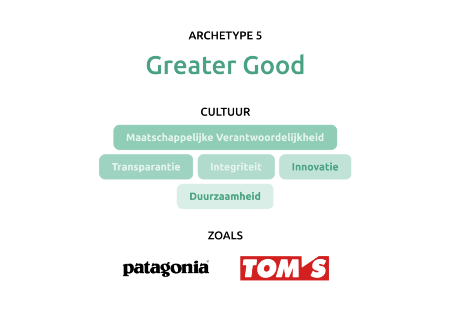 Passend Cultureel Archetype: Deze Greater-Good cultuur is gedreven door de missie om de wereld te transformeren en houdt vast aan bepaalde waarden. Van medewerkers wordt verwacht dat zij bijdragen aan het welzijn van de bredere gemeenschap en handelen in dienst van verantwoordelijkheden die verder reiken dan alleen hun klanten.