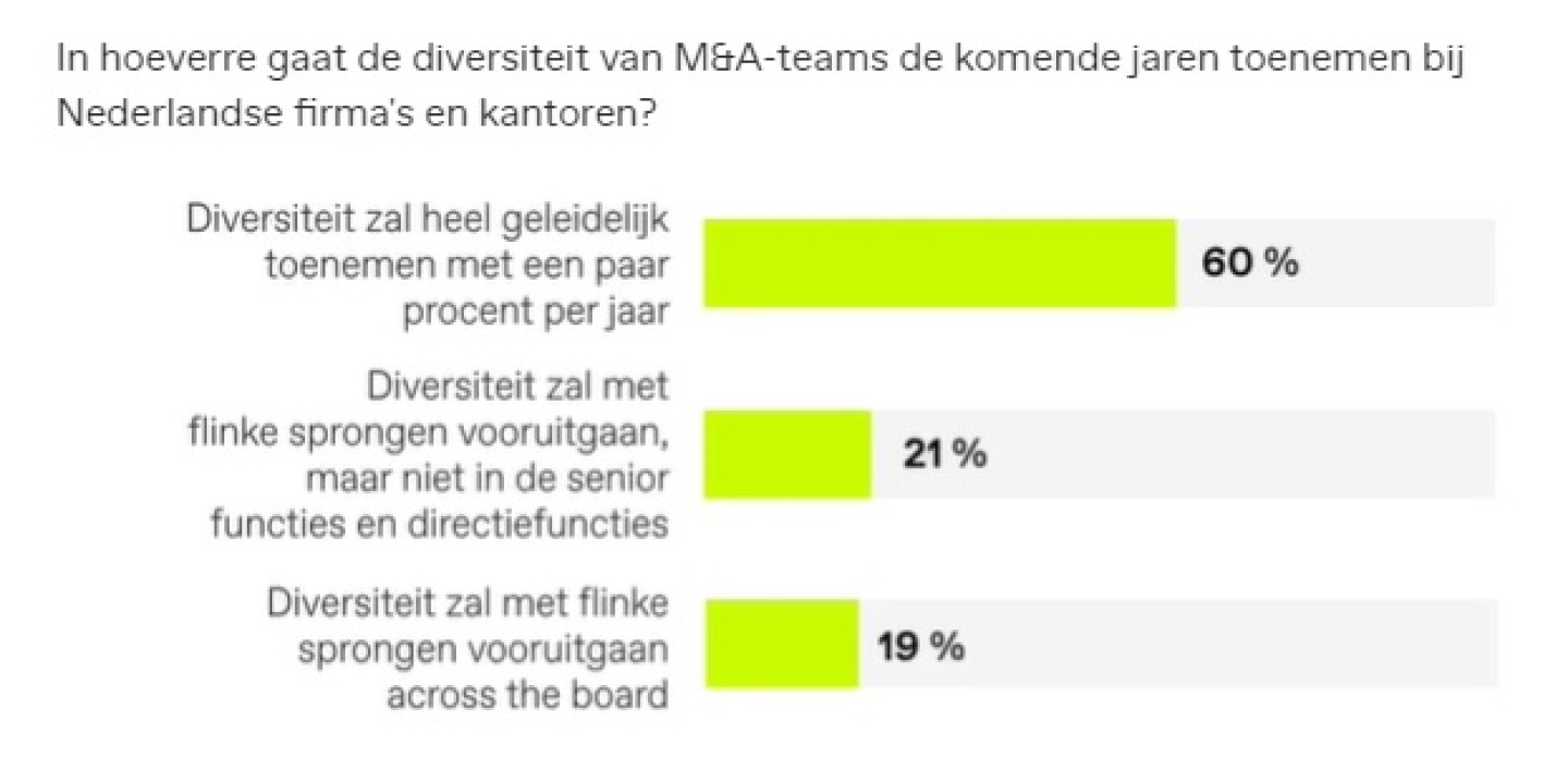 • M&A-professionals verwachten dat diversiteit de komende jaren gaat toenemen. 60 procent denkt dat dit geleidelijk zal gaan en 40 procent verwacht grote sprongen.
