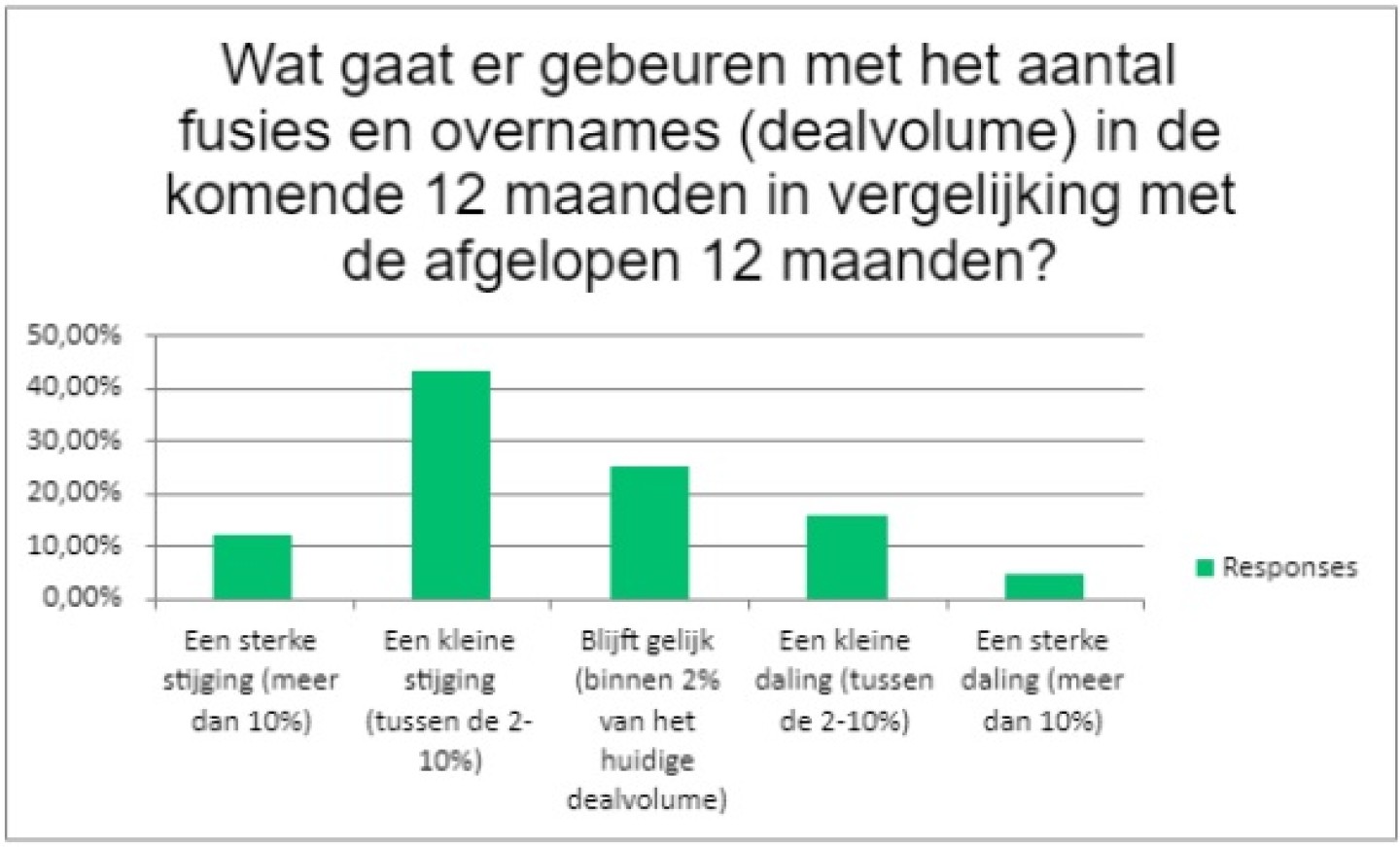 De meerderheid onder Nederlandse M&A-professionals (55%) verwacht een stijging van het dealvolume de komende twaalf maanden. Daarvan denkt twaalf procent dat het een sterke stijging wordt (van meer dan 10%) en 43 procent denkt een kleine stijging (tussen de 2 en 10%).