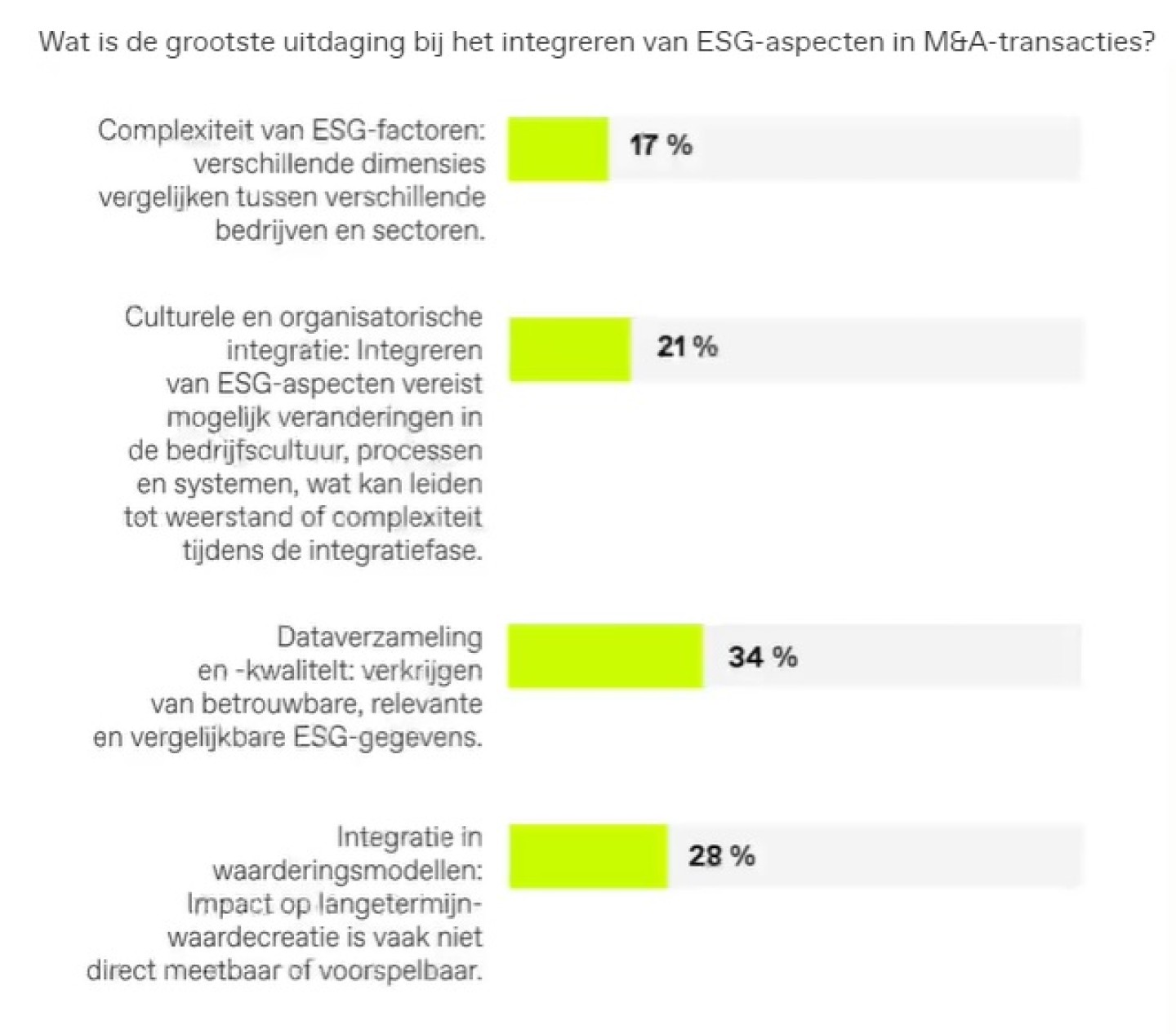 In het onderzoek kregen de deelnemers de vraag voorgelegd wat zij als grootste uitdaging beschouwen bij het integreren van ESG-aspecten in M&A-transacties. Er kwam niet één uitdaging uit die met kop en schouders boven de rest uitstak, maar alle vier de genoemde uitdagingen werden genoemd: