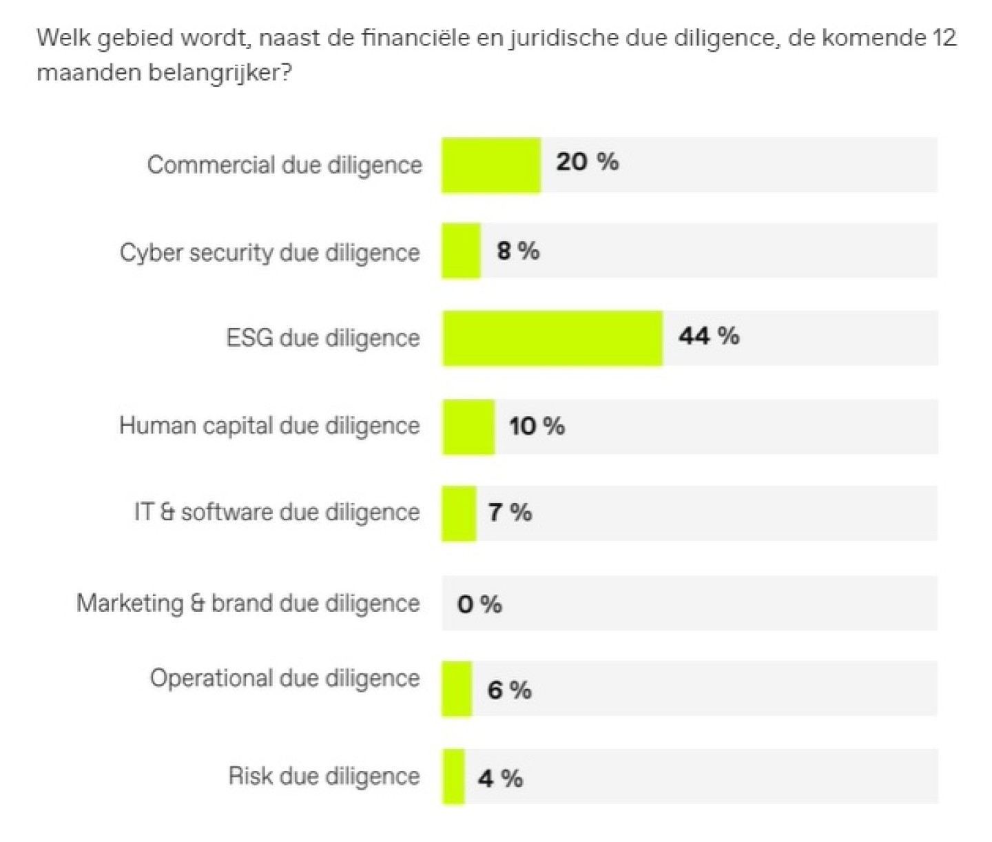 Ook regelmatig genoemd in het onderzoek worden human capital, cyber security, software & ICT en operational due diligence. Maar ESG DD staat dus duidelijk op pole position.