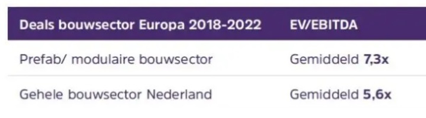 Waardering van bedrijven in de prefab sector Bedrijven in de prefab sector worden vaak gewaardeerd met behulp van de EV/EBITDA multiple. Dit is een snelle en robuuste methode om de marktwaarde te bepalen. Als vergelijkbare bedrijven recent zijn verkocht tegen een gemiddelde EV/EBITDA van 10x, dan kan een bedrijf met een EBITDA van één miljoen euro een bod verwachten van tien miljoen euro.