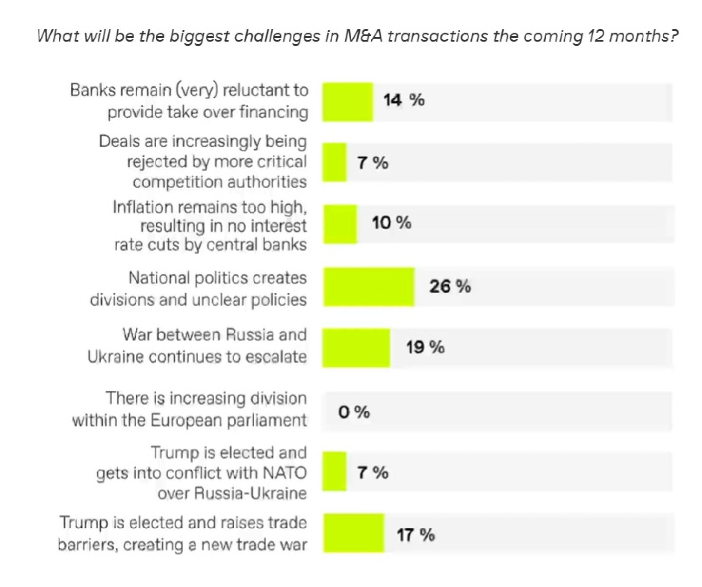 Conclusie Terwijl de M&A Community zich blijft bewegen door deze complexiteiten, weerspiegelt het heersende sentiment een duidelijke behoefte aan stabiliteit en duidelijkheid in zowel de nationale politiek als het bredere geopolitieke landschap. Met deze uitdagingen in het vooruitzicht worden dealmakers aangespoord om waakzaam en flexibel te blijven om succesvolle transacties in het komende jaar te waarborgen.