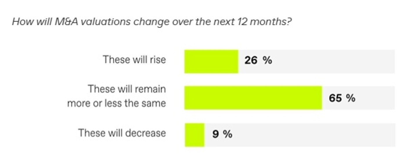 De meeste M&A-professionals (65 procent) in de Benelux denken dat de waarderingen de komende twaalf maanden min of meer vlak zullen blijven. 26 procent verwacht een stijging en negen procent verwacht een daling. De resultaten markeren een aanzienlijke verschuiving ten opzichte van vorig jaar. Destijds verwachtte slechts tien procent een stijging van de waarderingen, terwijl 46 procent verwachtte dat deze stabiel zouden blijven, en 44 procent een scherpe daling voorspelde.