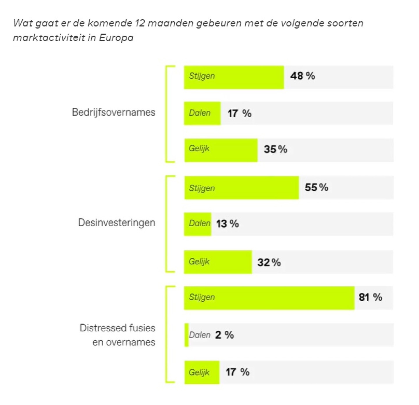 • Hogere rentes, inflatie en kosten leiden tot een toename in ‘distressed’ overnames, verwacht ruim 81 procent van de M&A-experts.