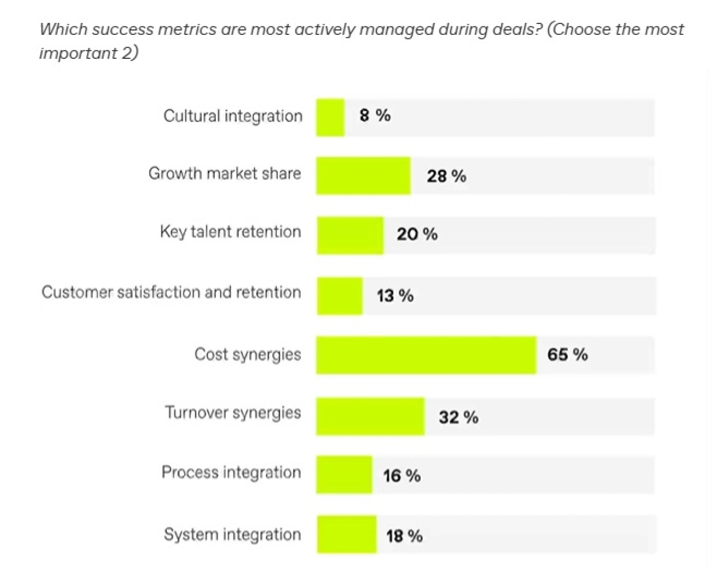 Respondenten wezen overweldigend op financiële indicatoren, waarbij kosten-synergiën bovenaan stonden (genoemd door 65 procent van de respondenten) als een van de belangrijkste indicatoren. Omzet-synergieën (32 procent) en groei van marktaandeel (28 procent) volgden, wat het blijvende belang van meetbare financiële resultaten benadrukt. Toch suggereren industrie-experts dat financiële indicatoren alleen mogelijk niet het volledige beeld van het succes van een deal geven.