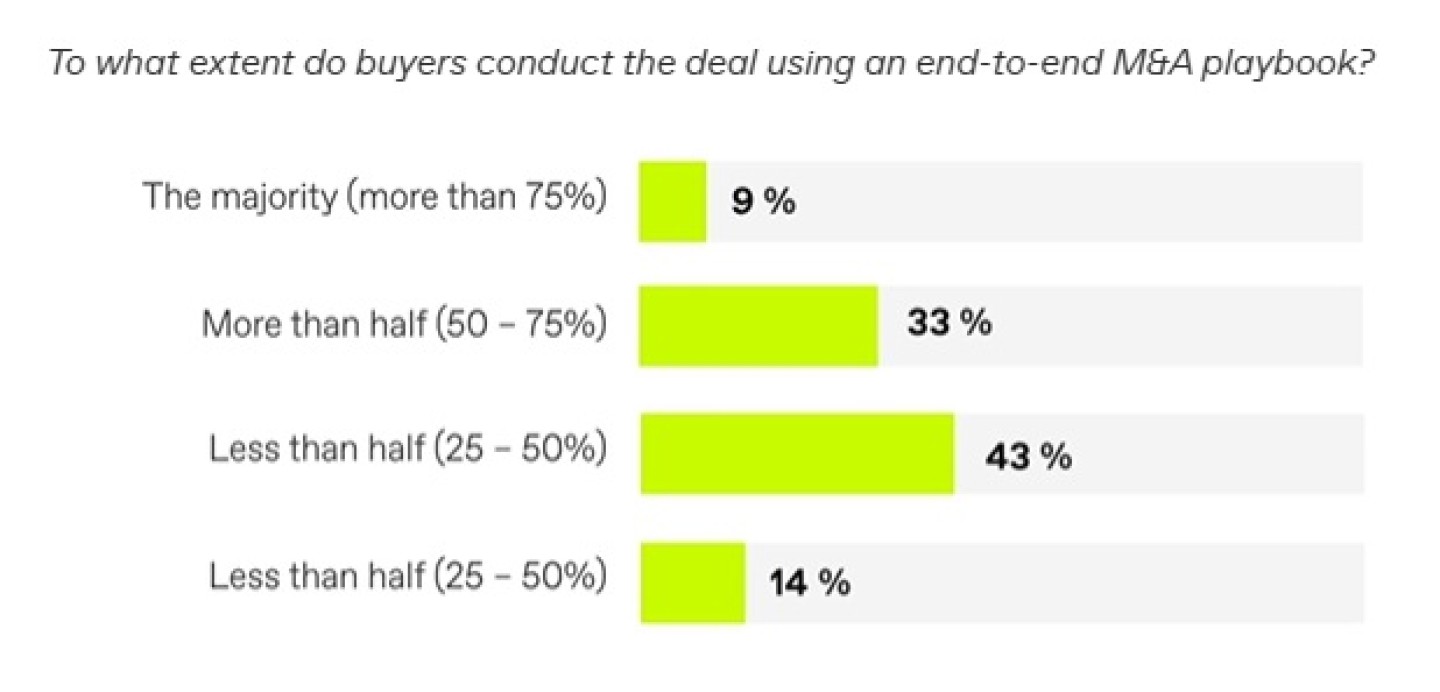 • Hoewel een gestructureerde, end-to-end-aanpak van fusies en overnames de dealresultaten verbetert, gebruiken niet alle kopers zo'n draaiboek.