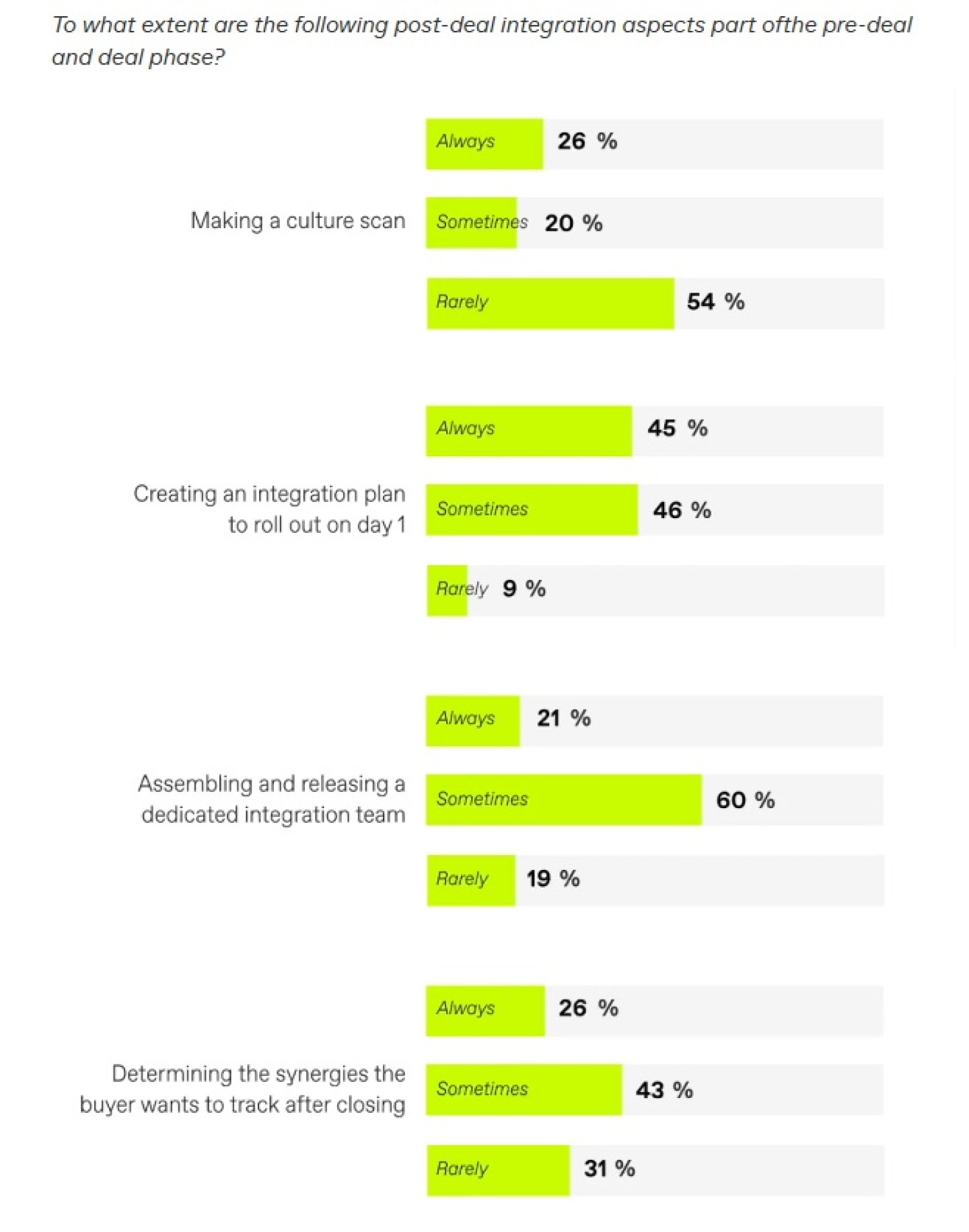 Een cultuurscan uitvoeren Een meerderheid – 54 procent – van de respondenten gaf aan dat een cultuurscan zelden deel uitmaakt van de pre-deal of dealfase. Deskundigen zijn het erover eens dat het negeren van culturele afstemming kan leiden tot aanzienlijke integratie-uitdagingen op de lange termijn.
