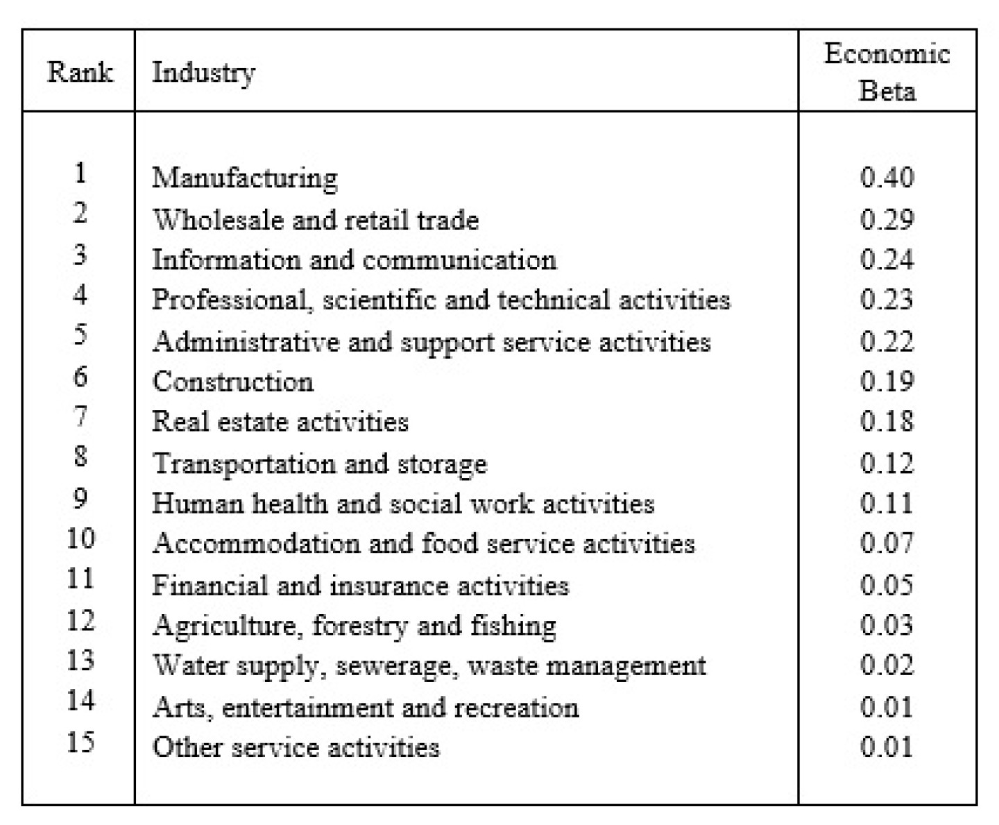 Tabel 1 – Rangschikking van economische bèta
