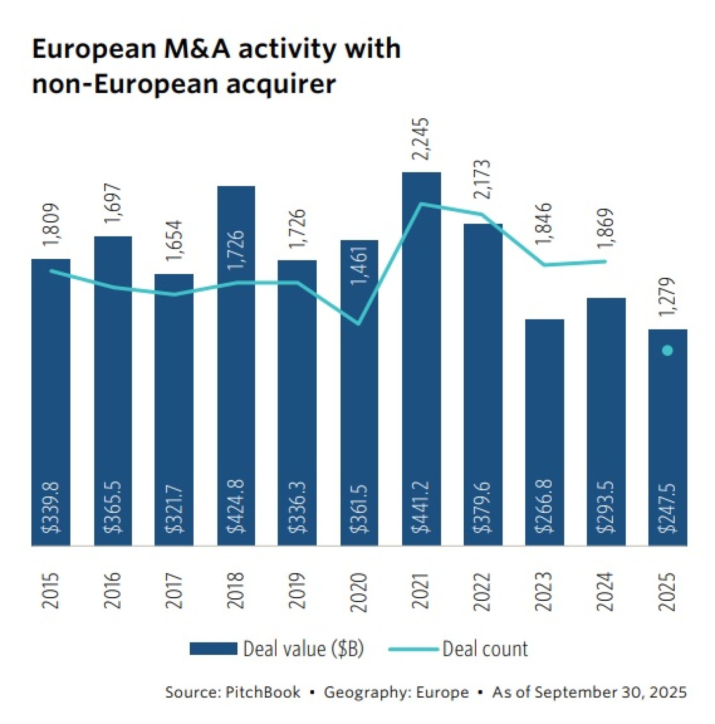 Toch blijft Europa een gewilde bestemming voor Amerikaanse kopers. Tot nu toe kondigden Noord-Amerikaanse bedrijven 952 Europese acquisities aan – beduidend meer dan de 677 deals van Europese bedrijven in Noord-Amerika.