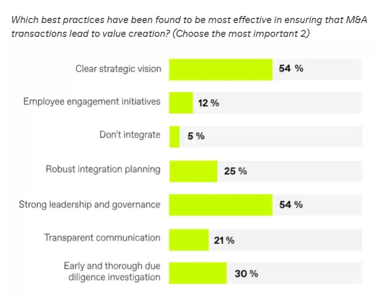 Een goed gedefinieerde strategische visie, gecombineerd met sterk leiderschap en bestuur, is van cruciaal belang voor het leveren van waarde in elke deal. Deze best practices werden genoemd door 54 procent van de deelnemende M&A-professionals. De derde best practice is een vroegtijdig en grondig due diligence-onderzoek, wat door 30 procent van de respondenten werd gekozen.