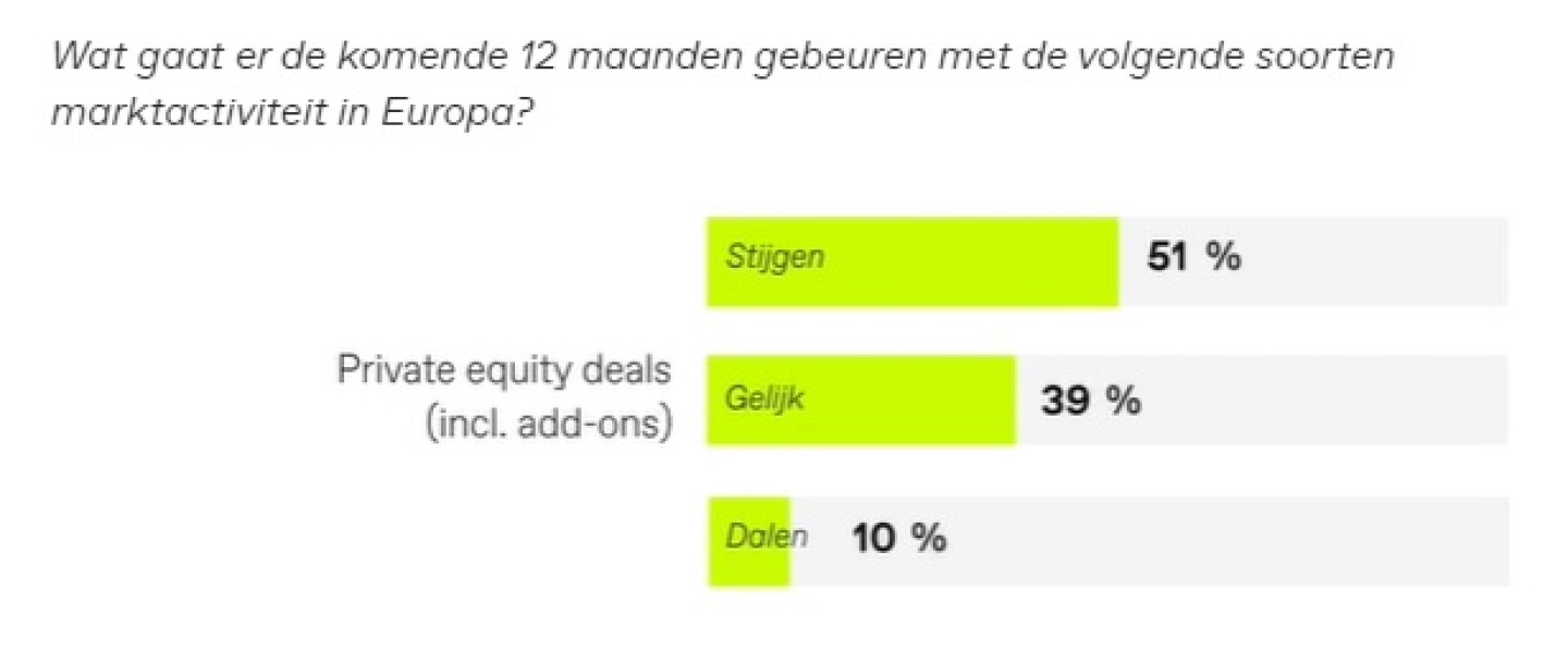 De vorige editie van dit M&A-onderzoek liet een gematigd positieve stemming zien ten aanzien van private equity (PE): ruim een derde van de respondenten verwachtte toen een stijging van het aantal PE-deals. Dit jaar zijn de respondenten nog positiever. Nu verwacht meer dan de helft (ruim 51%) een dergelijke stijging.